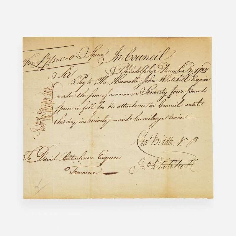Philadelphia, December 2, 1785. One sheet, 6 1/8 x 7 3/16 in. (155 x 182 mm). Manuscript pay order, signed by Charles Biddle as Vice President of the Supreme Executive Council of Pennsylvania, for John Whitehill, member of the Executive Council, for "Seventy four pounds specie in full for his attendance in Council until this day inclusively--and his mileage twice--"; counter-signed by David Rittenhouse as Treasurer, and John Nicholson; additionally signed by Whitehill at bottom; docketed on verso. Creasing from old folds.
