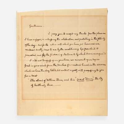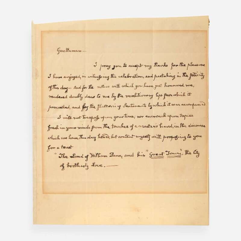 No place, no date (Philadelphia, ca. October 24, 1825). One sheet folded to make four pages, 9 1/4 x 8 in. (235 x 203 mm). One-page autograph speech, completely in the hand of John Quincy Adams as President of the United States, delivered to the second annual meeting of the Penn Society, given in commemoration of the 143rd anniversary of William Penn's landing in America. Creasing from old folds; mat burn along margins; left edge reinforced; remnants from old mount on verso of integral leaf.