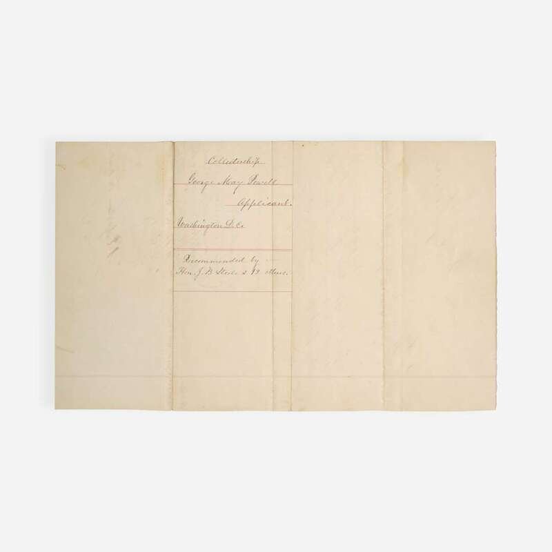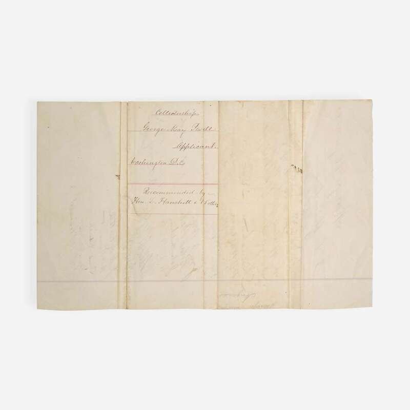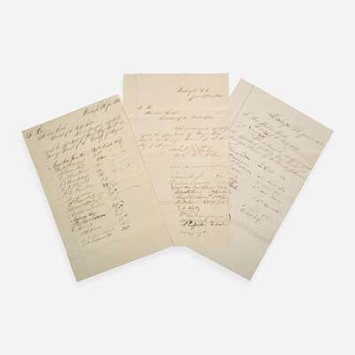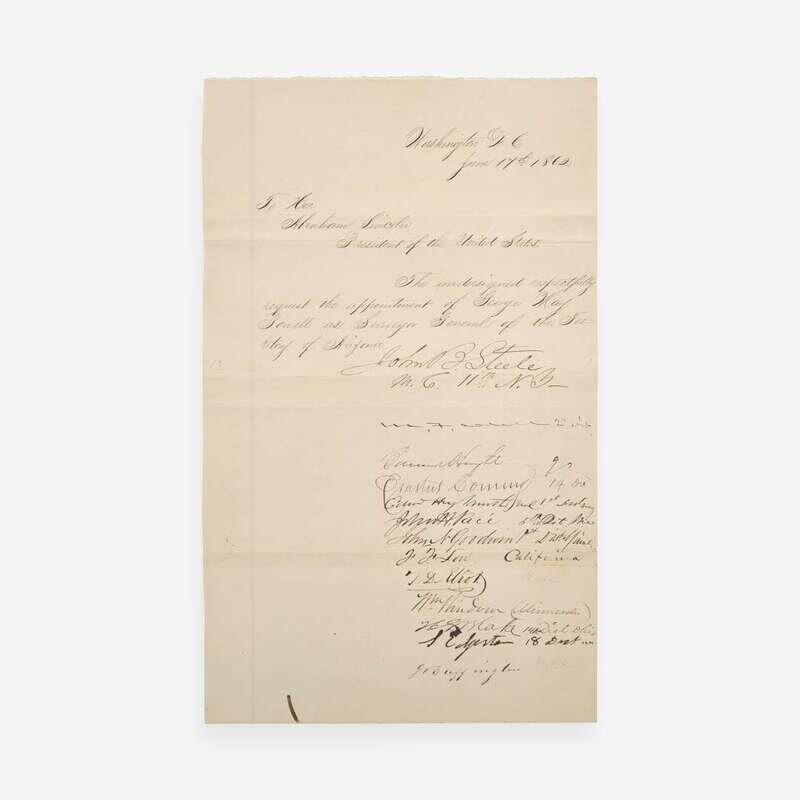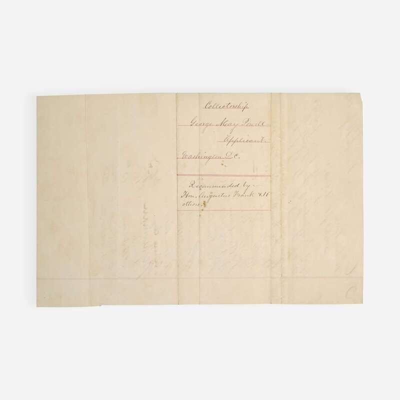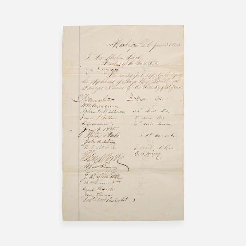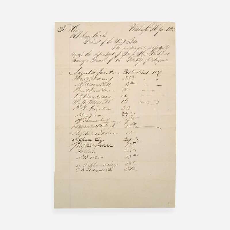Washington, D.C., June 17-23, 1862. Group of three manuscript petitions, each single sheets and measuring approximately 12 1/2 x 7 3/4 in. (317 x 197 mm). Each petition addressed to the President of the United States, Abraham Lincoln, requesting the appointment of George May Powell as Surveyor General of the Territory of Arizona; signed by 47 individuals, all members of the House of Representatives in the 37th U.S. Congress, some of whom add the district they represented. Each sheet docketed on the verso, "Collectorship / George May Powell / Applicant. / Washington D.C./ Recommended by..." Creasing from old folds; some edges trimmed; lightly toned.