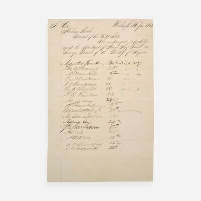 Signatures include: future Vice-President William A. Wheeler (1819-1887); John B. Steele (1814-1866); Erastus Corning (1794-1872); John H. Rice (1816-1891); John N. Goodwin (1824-1887); William Windom (1827-1891); Harrison G.O. Blake (1816-1876); Augustus Frank (1826-1895); William Wall (1800-1872); Burt Van Horn (1823-1896); Jacob P. Chamberlain (1802-1876); Reuben E. Fenton (1819-1885); Alexander S. Diven (1809-1896); Robert B. Van Valkenburgh (1821-1888); Stephen Baker (1819-1875); Alfred Ely (1815-1892); Socrates N. Sherman (1801-1873); Ambrose W. Clark (1810-1887); Abram B. Olin (1808-1879); Elbridge G. Spalding (1809-1897); Charles B. Sedgwick (1815-1883); James S. Rollins (1812-1888); John W. Wallace (1818-1889); Andrew J. Clements (1832-1913); John F. Potter (1817-1899); Portus Baxter (1808-1868); John Hutchins (1812-1891); Warren P. Noble (1820-1903); William H. Wallace (1811-1879); A. Scott Sloan (1820-1895); Timothy O. Howe (1816 -1883); James R. Doolittle (1815-1897); Hiram P. Bennet (1826-1914); Cyrus Aldrich (1808-1871); James F. Wilson (1828-1895); Robert McKnight (1820-1895); Luther Hanchet (1825-1862); Moses F. Odell (1818-1866); Edward H. Smith (1809-1885); Frederick Low (1828-1894); Thomas D. Eliot (1808-1870); Sydney Edgerton (1818-1900); Edward Haight (1817-1875); James Buffington (1817-1875); Theodore M. Pomeroy (1824-1905).
