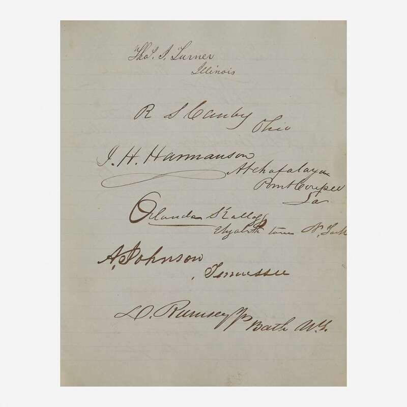 During the compilation of this album the Treaty of Guadalupe Hidalgo was signed, ending the Mexican-American War, and ceding to the United States virtually all of the Southwest, including the present-day states of California, Nevada, Utah, New Mexico, and most of Arizona and Colorado. In the coming decade the debate over the spread of slavery here, and elsewhere, would inflame American politics and divide the nation. The roster of politicians represented here portends this rupture that in 13 years time would, with the election of Lincoln as President, result in the Civil War, with many signers taking up arms against each other by serving either for the Union or the Confederacy. Critically, the three signatures of Buchanan, Lincoln, and Johnson, represent the years preceding, during, and after, this conflict.
