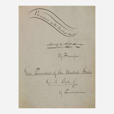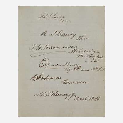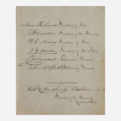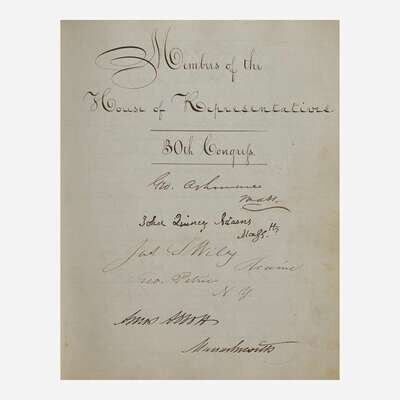 A remarkable and unique autograph album: a near-complete representation of the 30th Congress of the United States as well as the administration of James K. Polk. Based on the present signatures this album was presumably compiled sometime between late 1847 and mid-1848, during the final two years of Polk's only term as president. Significantly, this album is signed by five present, past, and future United States Presidents, including Polk, a young Abraham Lincoln during his only term as a United States Congressman, an elderly John Quincy Adams before his sudden death in February 1848, and future presidents James Buchanan and Andrew Johnson, presidential bookends of the Civil War. Other signatures include the "Great Triumvirate" of Henry Clay, Daniel Webster, and John C. Calhoun, three of Antebellum America's three most powerful politicians. Other signatures include, Samuel Houston, first President of the Republic of Texas and then senator from Texas; Hannibal Hamlin, first Vice-President under Lincoln and then senator from Maine; Joshua R. Giddings, leading abolitionist from Ohio, and co-sponsor with Lincoln during this term of a bill to end slavery; Thomas Hart Benton, five-term Senator from Missouri and proponent of Westward Expansion; Jefferson Davis, future President of the Confederate States and then senator from Mississippi.