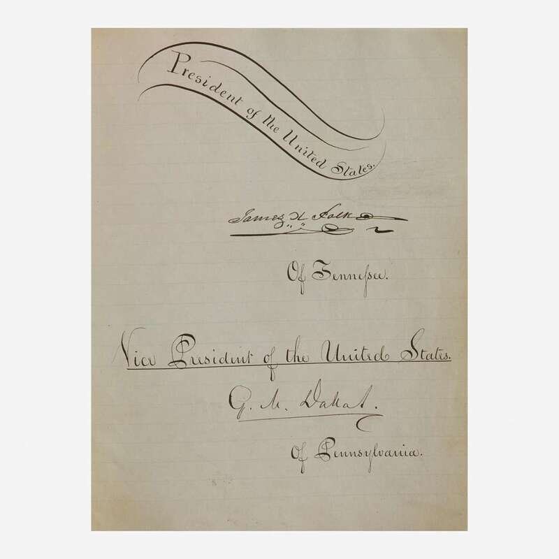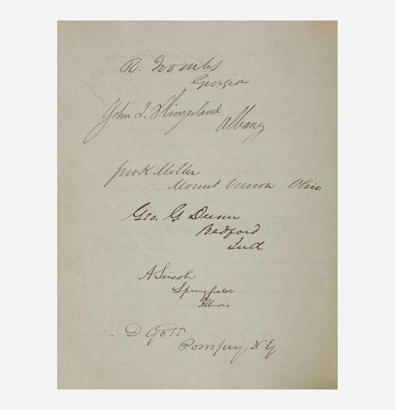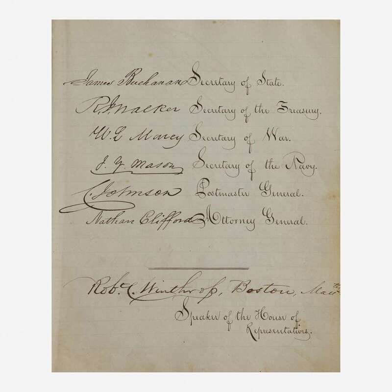 Washington, D.C., ca. 1847-48. Autograph album of the executive and legislative branches of the United States government during James K. Polk's administration. Comprising 293 signatures on 33 leaves, rectos and versos, ranging between two to seven signatures per page. Including five United States Presidents: James K. Polk, as 11th President; James Buchanan, as Secretary of State (15th President); Abraham Lincoln, as a Congressman from Illinois (16th President); John Quincy Adams, as a Congressman from Massachusetts (6th President); Andrew Johnson, as a Congressman from Tennessee (17th President); 210 (of 230) members of the House of Representatives (each signer has added their district); 55 (of 60) Senators (each signer has added their state); Vice-President George M. Dallas; six members of Polk’s Cabinet: Buchanan, Robert Walker as Treasurer, William L. Marcy as Secretary of War, John Y. Mason as Secretary of the Navy, Cave Johnson as Postmaster General, and Nathan Clifford as Attorney General; eight "Officers of the United States Army": Major General John A. Quitman, Benjamin McCulloch of the Texas Rangers, Brigadier General James Shields, Brigadier General John Garland, Colonel William G. Belknap, Brigadier General Frederick Searle, Colonel William S. Harney (later Brigadier General), and, interestingly, U.S. spy of Tampico, Anna Chase (wife of U.S. Consul to Mexico, Franklin Chase)--the only woman to sign this album; Henry Clay, dated January 1848; Secretary and Clerk of the House and Senate; Sergeant at Arms of each chamber. Original brown flexible leatherette binding, stamped in gilt, extremities worn, spine perished, front and rear covers starting, loss at bottom corner of front cover, all edges gilt; yellow endpapers.
