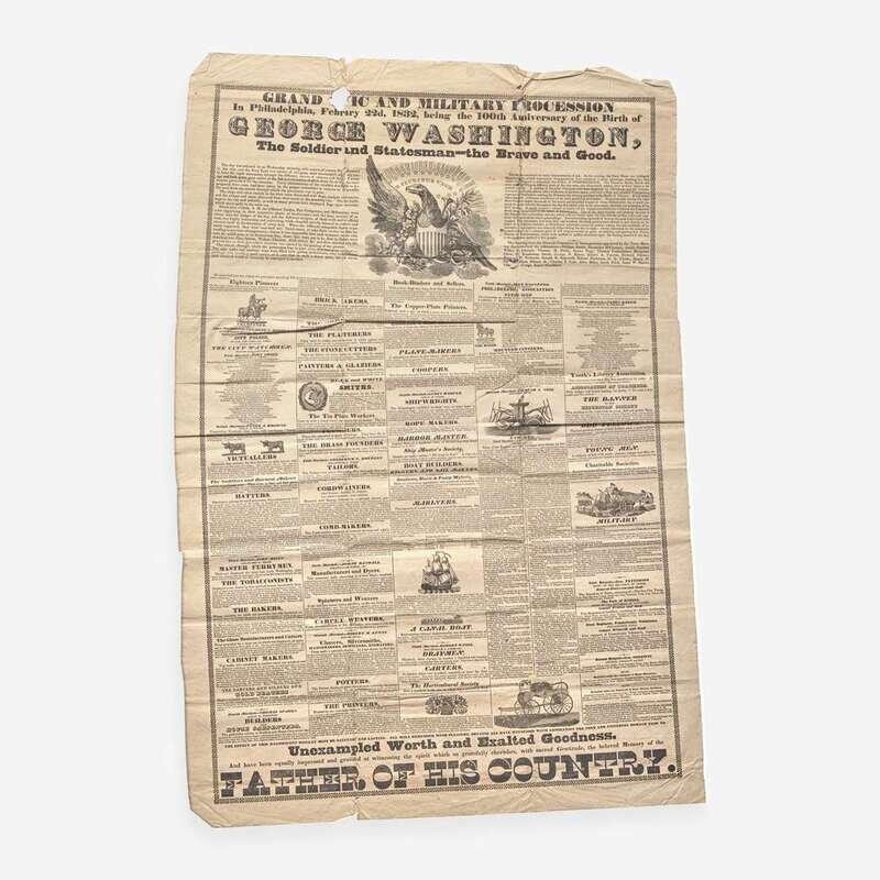 A very rare and unsophisticated broadside outlining the massive parade and related festivities held in Philadelphia on February 22, 1832 in celebration of the centennial of George Washington's birth. With an estimated 5,000 participants and over 100,000 spectators, this event was one of Philadelphia's largest public celebrations in the 19th century. The parade brought together a diverse range of about 122 of Philadelphia's various merchant and trade groups, benevolent and scientific societies, civic associations, and military brigades. The line was led by eighteen Pioneers--a body of men armed with axes--and was followed by Chief Marshal Colonel Clement Biddle and Mayor Benjamin W. Richards. They were followed by groups and officials representing the area's various counties; Irish, French, and German immigrant societies; neighborhood fire companies; groups representing Jefferson Medical College, the University of Pennsylvania, the Franklin Institute, and the Academy of Natural Sciences; trade groups representing victuallers, ferrymen, bakers, potters, printers--led by Matthew Carey--booksellers and bookbinders, silversmiths, coopers, shipbuilders, and more; library and teacher associations; and the Horticultural and Hunting Park Associations. The line began at Third and South Streets, and proceeded through downtown Philadelphia before ending at Independence Hall where Philadelphia lawyer William Rawle read Washington's Farewell Address.