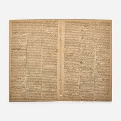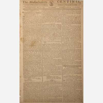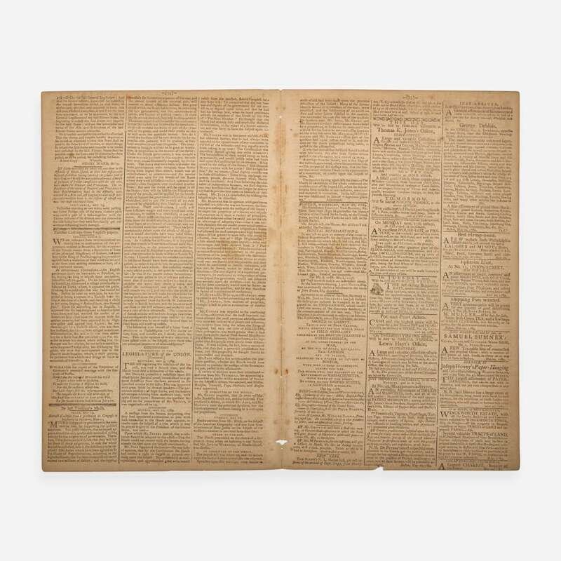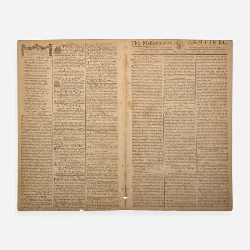 Boston: Published by Benjamin Russell, Wednesday, May 20, 1789. No. 19, Vol. XI. Bifolium leaf, 14 3/4 x 18 1/2 in . (375 x 470 mm). Printed newspaper in three columns. Disbound; edges trimmed; separations along center fold; scattered stains.