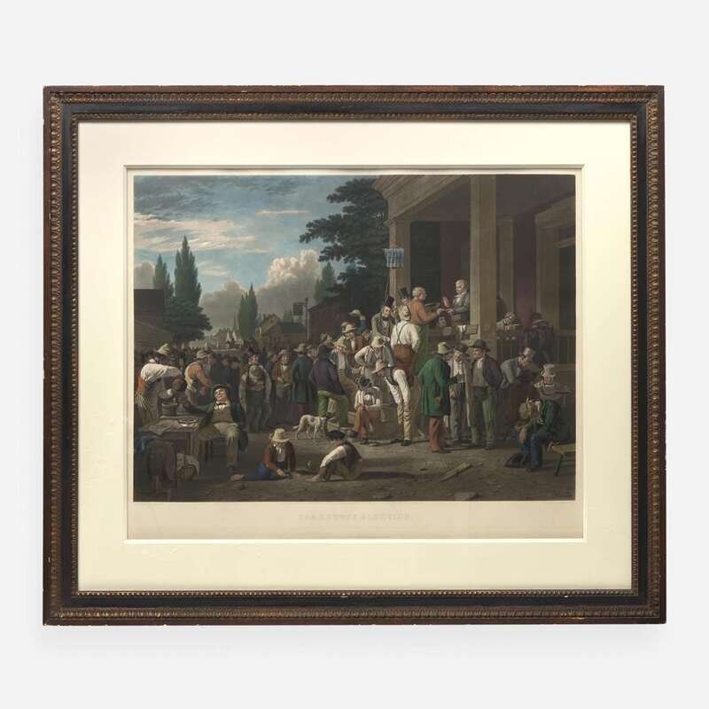 New York, etc.: Goupil & Co., 1854. Line and mezzotint engraving with later hand-coloring; printed by Jas(on). Irwin. Engraved by John Sartain after the painting by George Caleb Bingham. Scattered wear along sheet edges; remnants from old mount along top edge verso. 29 x 36 ½ in. (737 x 927 mm). In mat and in frame, 36 x 42 in. (927 x 1,067 mm). Bloch, The Paintings of George Caleb Bingham: A Catalogue Raisonné, 260