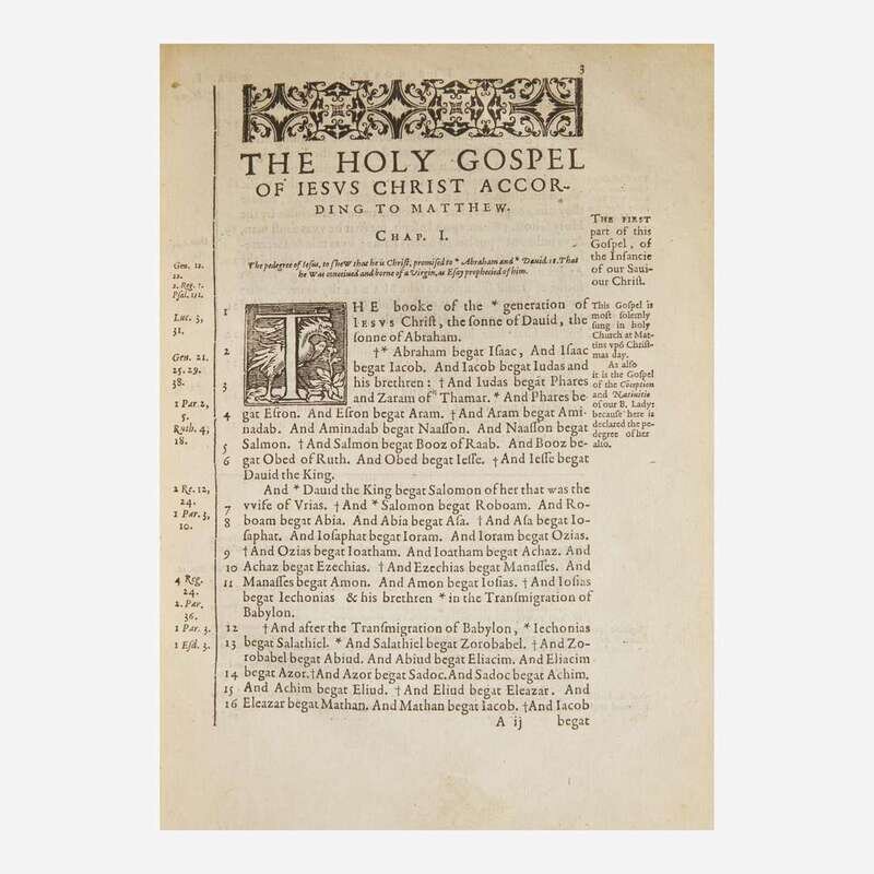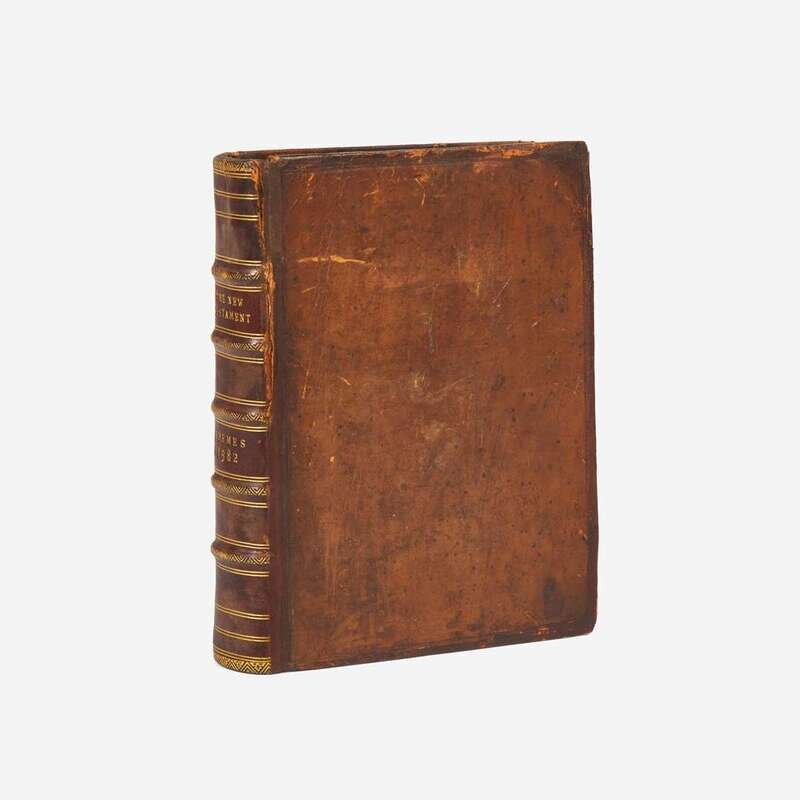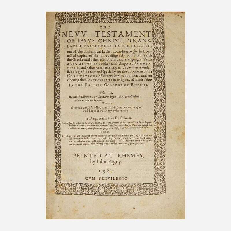 "The editio princeps of the Roman Catholic version of the New Testament in English.Translated from the Vulgate by Gregory Martin, under the supervision of William Allen (afterwards Cardinal Allen), and of Richard Bristow." (Herbert, p. 96) Following the restoration of English Protestantism by Queen Elizabeth I, Allen established the English College at the University of Douai in France in 1568 to serve as a bastion for exiled Catholics and to supply the Catholic Church with priests. By the time Martin began his translation in 1578, the English College was the center of English Catholic life, and at the time was temporarily removed to the safe haven of Rheims due to religious conflict with Calvinists. The project of completing a full Catholic Bible in English served to provide English Catholics not only with a version they could read and understand, but also to counter the many Protestant translations that were often antithetical to their needs and beliefs. Martin finished this translation in March 1582 but due to funding issues the Old Testament was not completed for another 27 years, in 1609. Once completed, the full Douai-Rheims Bible proved influential for the completion of the 1611 King James Bible (see lot 167), and was often consulted by its revisors.