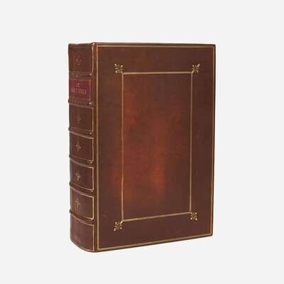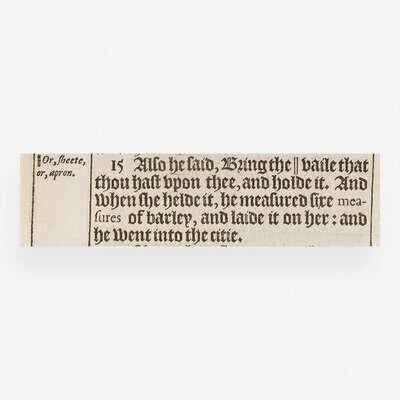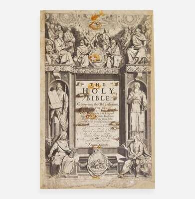 An exceedingly rare and almost-complete first edition of the King James Bible, often considered, "the only literary masterpiece ever to have been produced by a committee." Commonly known as the Authorized Version, this Bible was royally commissioned in the hopes of settling conflicts within the Church of England, between Puritans and Anglicans, as well as in the division between Bibles used by the clergy--the Bishop's Bible--and those used by laymen--the more compact and easier to read Geneva Bible. In 1604 King James gave enthusiastic support to the idea of a new translation after its suggestion by the leader of the Puritan party and President of Corpus Christi College, John Reynolds. The work was completed by nearly 50 translators, divided into six companies, who were each tasked with translating certain sections of the Scriptures. The six companies consulted a variety of works, including Hebrew and Greek sources, as well as the Bishop's Bible for the basic English text, and the Tyndale and Coverdale versions of the Geneva Bible. Although not mentioned, they also borrowed freely from the Catholic translation of the New Testament published in Rheims in 1582 (see lot 166). The primary work was completed from 1607-09, and was then sent to a committee of six at Stationer's Hall in London where a final revision took place for the better part of 1610. Two editions of the Bible were printed in 1611 and have come to be known as the "He" and "She" Bibles, for their respected readings in Ruth iii. 15: "he went into the citie," and "she went into the citie." These two versions were printed at two different offices, likely to speed up printing, and the discrepancy lies more in the ambiguity of the passage than perhaps any fault at the hands of the typesetter. While the Hebrew text says "he" went into the city, referring to Boaz, the context of the passage makes more sense with "she", referring to Ruth. While early bibliographers disputed the priority of these two versions, they now "generally agree that the folio 'He' Bible of 1611 is the first impression." (Darlow & Moule, p. 133).