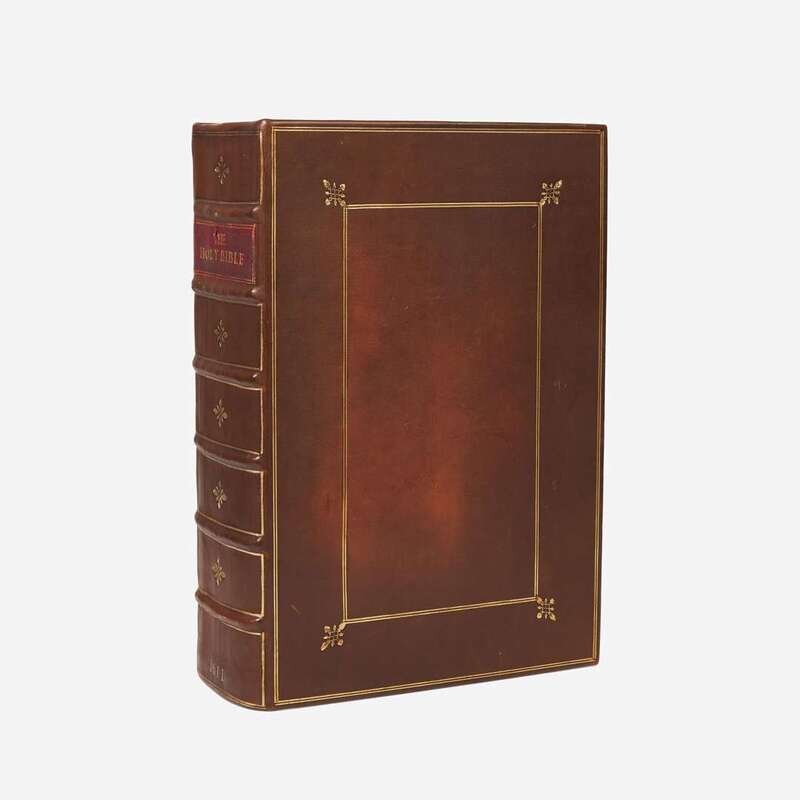 London: Robert Barker, 1611. First edition (with "he went into the citie" in Ruth iii. 15, three lines repeated in Exodus xiv. 16, and other points detailed in Darlow & Moule). Thick folio, 15 x 10 in. (381 x 254 mm). (xxxviii), 34, (1,426) pp.; final leaf (Aa6) supplied in facsimile. Text printed in gothic and roman types, in two columns within ruled border; calendar printed in red and black. Illustrated with an engraved general title-page by C(ornelis). Boel; 34 pp. of genealogical tables incorporating woodcut illustrations of Adam and Eve, Noah's Ark, the Tower of Babel, etc.; New Testament title-page with woodcut border; two-page map of Canaan supplied in facsimile; numerous woodcut initials, as well as head- and tail-pieces. Bound to style in full modern brown calf, stamped in gilt, red morocco spine label; all edges trimmed; general title-page worn, with many open tears at center, and laid down on heavy paper with some text filled in; several rust stains on title-page, diminishing over the following seven leaves, but affecting some text on first page of Dedication; wear and creasing along edges and in corners of prelims; repaired closed tear to bottom fore-edge, A2 in prelims; several leaves washed; varying degrees of dampstaining along top edge and within gutter of most leaves; scattered old mold residue in upper gutter of many leaves; top edge trimmed close, variously shaving ruled border and some letters in running headline, especially at front and at rear; six-inch repaired closed tear at bottom edge, Kk4 in Old Testament; small open tear in upper center of New Testament (NT) title-page, extending into subsequent two leaves (A2 and A3); bottom corner torn away, but not affecting text, B1 in NT; 2 3/4 in. closed tear at bottom center edge, B2 in NT; bottom of fore-edge and corner torn away, but not affecting text, X6 in NT; leaf Aa5 in NT very worn with loss in top edge. Herbert 309 (Darlow & Moule 240); ESTC S122347; PMM 114; Formatting the Word of God 9.1; Brake BHC-119