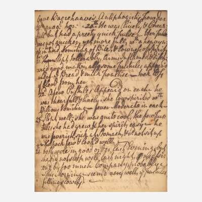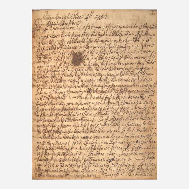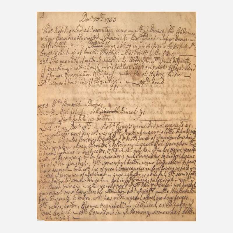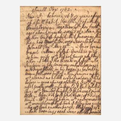 A unique 18th-century medical diary, featuring over 40 entries, with some related to St. Thomas's Hospital in London, and others related to Philadelphia, as well as Edinburgh, Scotland. A few of these entries touch on cases of smallpox, smallpox inoculation, as well as other ailments involving fevers, epilepsy, palsy, etc. The majority of the entries are dated to the mid 1750s--the period immediately following the English smallpox epidemic of 1751-53--and provide a distinct viewpoint from a practicing physician of the time. The many entries detail at great length the patient's symptoms, sometimes their occupation, various courses of medical treatment--including pharmacological prescriptions and apothecary remedies--and the trajectory of recovery. Although the author(s) of the various entries is not known, as they are not signed, many of them appear to be in a single hand, and make reference to many colleagues, including a Dr. Lewis, Dr. Milner, Dr. Reeve, Dr. Letherland, Dr. John Rutherford (1695-1779), Dr. Sedwick of Manchester, Dr. Jones of Bradford, etc. Other entries in this volume are seemingly unrelated, and in different hands, including a partial diary entry of a religious nature, dated 1784, and an account of the 1752 South Carolina hurricane.