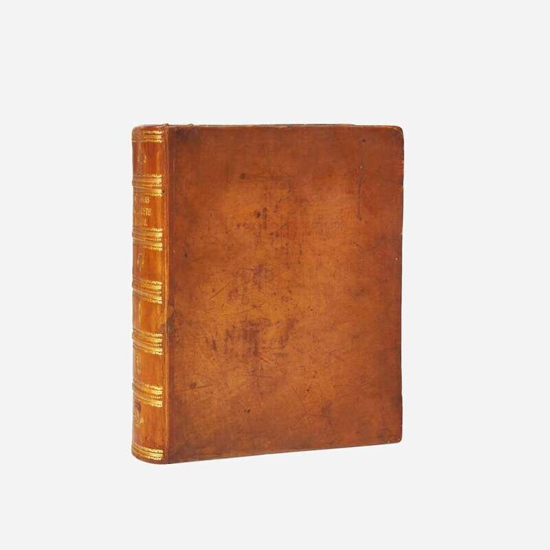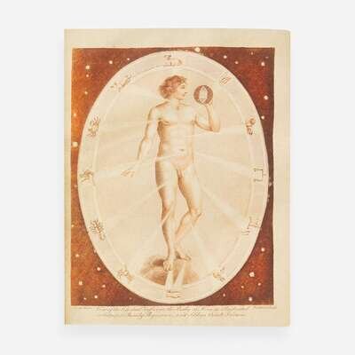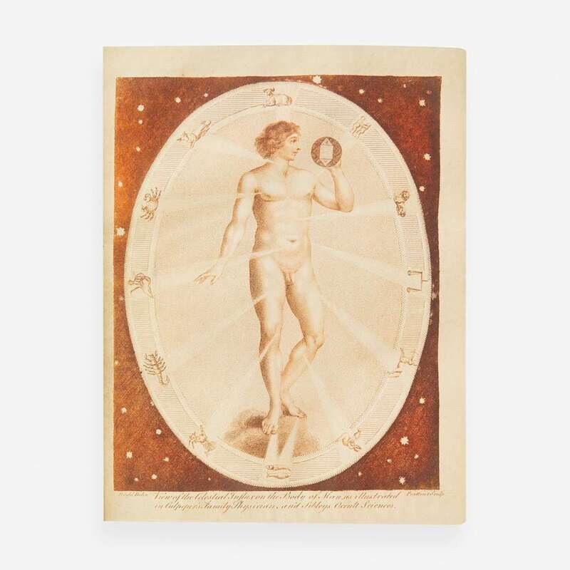 London: Printed for the Author, and Sold at the British Directory Office...and by Champante and Whitrow, (ca. 1790s). Two volumes bound as one. 4to. xvi, 396; (ii), 256, 397-398 pp. Illustrated with an engraved frontispiece portrait of Culpeper and 29 hand-colored botanical engravings in first volume; engraved frontispiece printed in red and 12 engraved anatomical plates printed in red in second volume. Full contemporary tan calf, rebacked, stamped in gilt, boards and extremities rubbed; all edges trimmed; small oval botanical illustration by J. Orme, 1794, laid in; scattered light to moderate foxing to text; offsetting from plates onto text. ESTC N69195