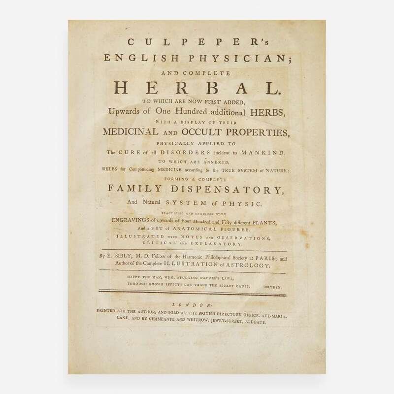 First printed in 1652, Culpeper's Herbal proved to be incredibly popular and influential and was often reprinted. A very good copy with handsome hand-colored engravings.