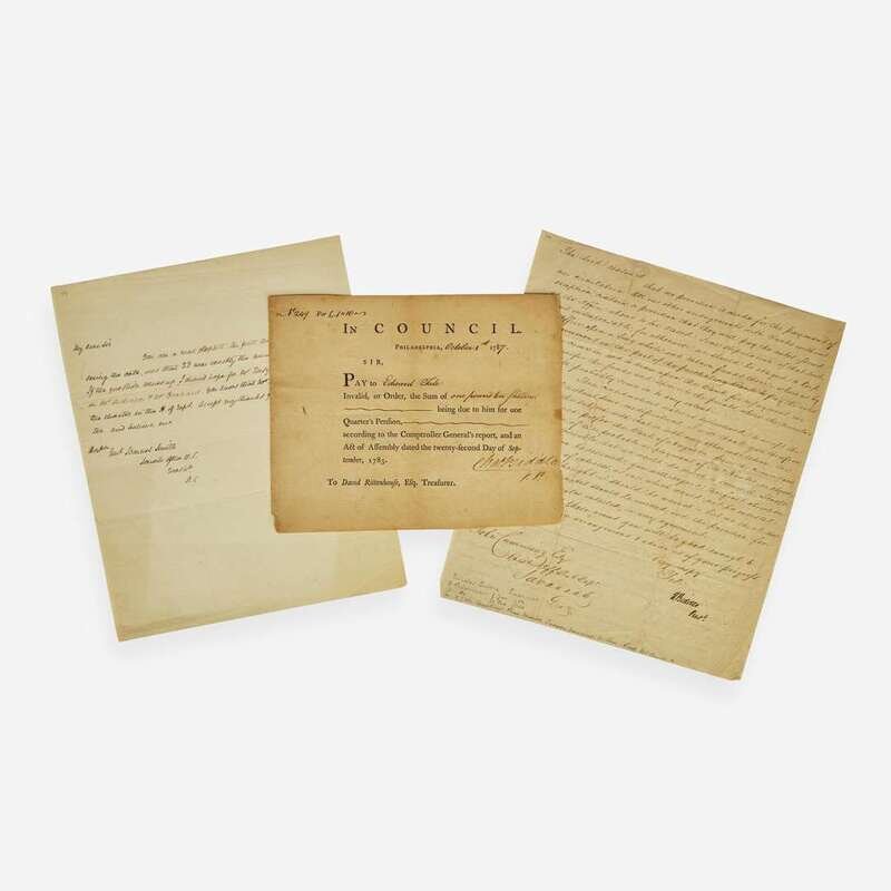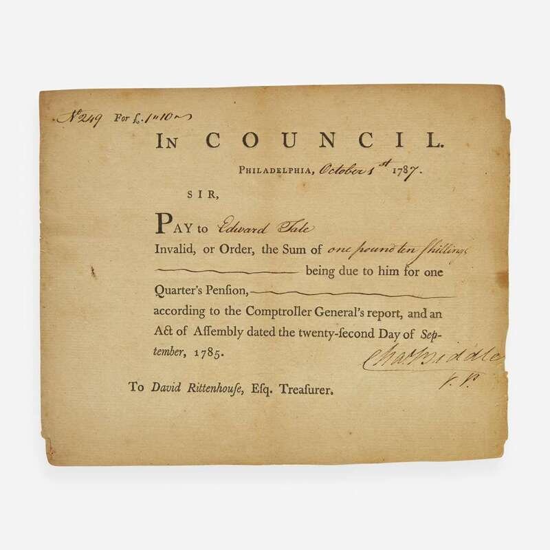 Philadelphia, October 1, 1787. One sheet, 6 1/2 x 8 in. (165 x 203 mm). Partially-printed Supreme Executive Council of Pennsylvania pay order (No. 249), signed by Charles Biddle as Vice-President, ordering Treasurer David Rittenhouse to pay Revolutionary War veteran Edward Tate, "Invalid, or Order, the Sum of one pound ten shillings being due to him for one Quarter's Pension according to the Comptroller General's report, and an Act of Assembly dated the twenty-second Day of September, 1785."; manuscript on verso, "Octr 1787". Lightly toned along edges.