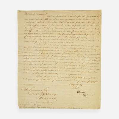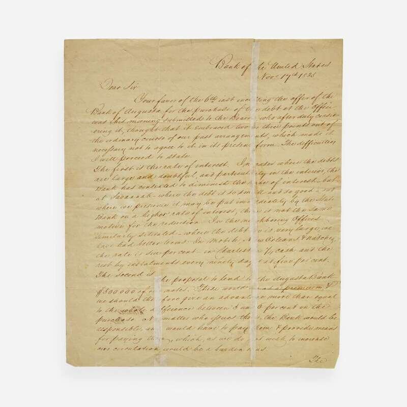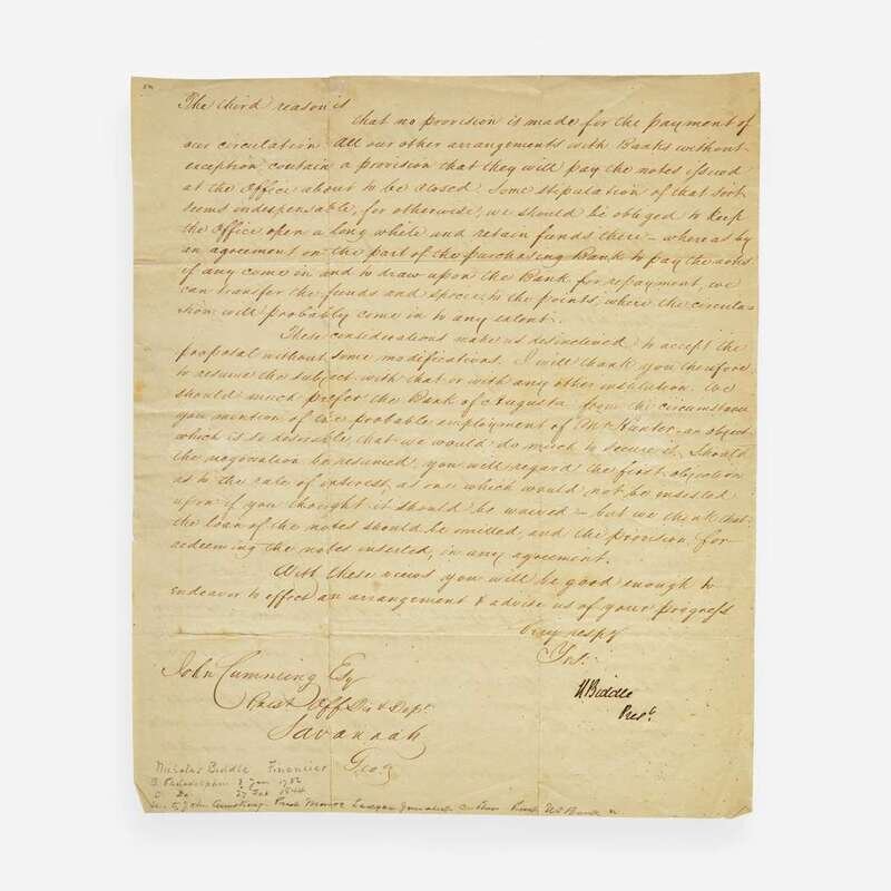 (Philadelphia): Bank of the United States, Nov(embe)r. 17, 1835. One sheet, 10 3/8 x 8 3/4 in. (263 x 222 mm). Two-page manuscript letter in a secretarial hand, signed by Nicholas Biddle as President of the Second Bank of the United States, to John Cumming, President of the Savannah, Georgia branch of the Bank of the United States, declining the submission of a proposal by Cumming for the Bank of Augusta to purchase debt at the Savannah branch. Creasing from old folds, two repairs along vertical folds on recto.