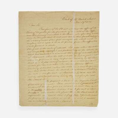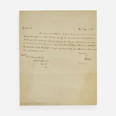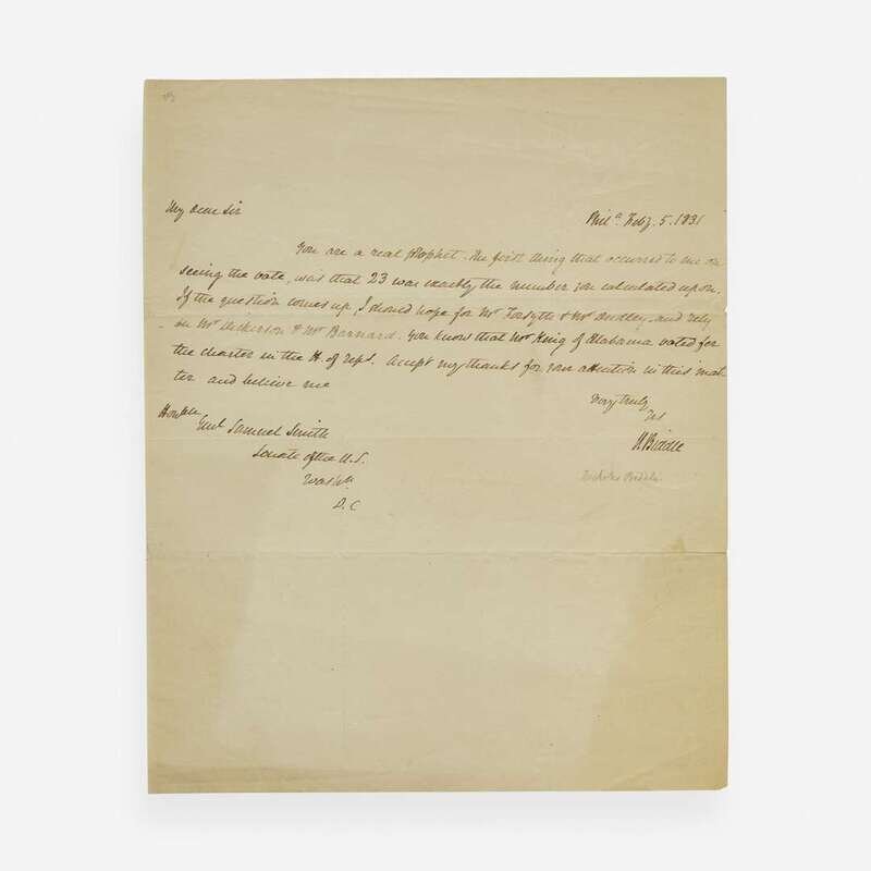Phil(adelphi)a, Feb(ruar)y 5, 1831. One sheet, 9 13/16 x 8 in. (249 x 203 mm). One-page autograph letter, signed by Nicholas Biddle as President of the Second Bank of the United States, to Maryland Senator Samuel Smith, Chairman of the Committee on Finance, regarding the results of a recent resolution introduced by Missouri Senator Thomas Hart Benton to not renew the charter of the Second Bank of the United States: "You are a real prophet. The first thing that occurred to me on seeing the vote, was that 23 was exactly the number you calculated upon. If the question comes up, I should hope for Mr. (John) Forsyth & Mr (Charles E.) Dudley, and rely on Mr (Mahlon) Dickerson & Mr (Isaac D.) Barnard. You know that Mr. (William R.) King of Alabama voted for the charter in the H. of Reps. Accept my thanks for your attention in this matter..." Creasing from old folds.