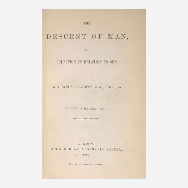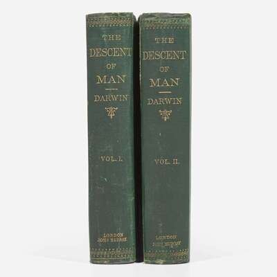 A handsome first edition of Darwin's seminal work on human evolution. Containing the first appearance of the word "evolution" in any of Darwin's work, on p. 2 of first volume--preceding its appearance in the sixth edition of his Origin of Species that was published the following year. "This is really two works. The first demolished the theory that the universe was created for Man, while in the second Darwin presented a mass of evidence in support of his earlier hypothesis regarding sexual selection." (Garrison-Morton 170).