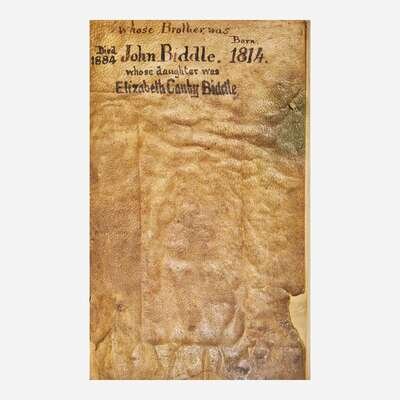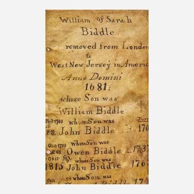 This archive is related to the branch of the Biddle family descended from John (1707-1789) and Sarah (1711-1773) Biddle. The couple migrated to Philadelphia in the 1720s from West New Jersey, where William Biddle (1630-1712) first established the family in America in the 1680s (see Lot 34). The first generation of the Philadelphia Biddles were instrumental in shaping the mercantile, cultural, and political landscape of both Pennsylvania and the early United States.