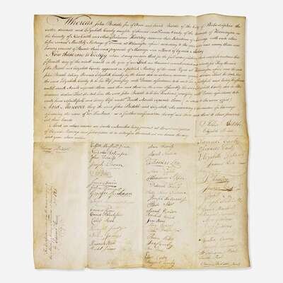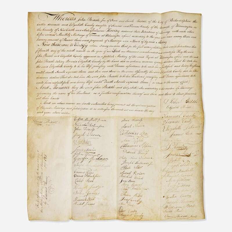 29. Wilmington, (Delaware), September 19, 1796. Manuscript document, signed. Marriage certificate on vellum, for John (1763–1815) and Sarah (nee Canby) Biddle. Signed by 56 individuals who were present, mostly members of their families, including Thomas A. Biddle (1776-1857), Anna Biddle (1742-1807), Clement Biddle, Jr. (1778-1856), Owen Biddle, Jr. (1774-1806), et al.