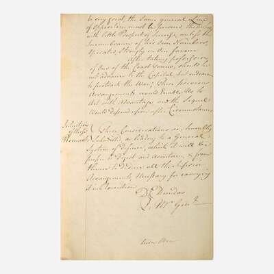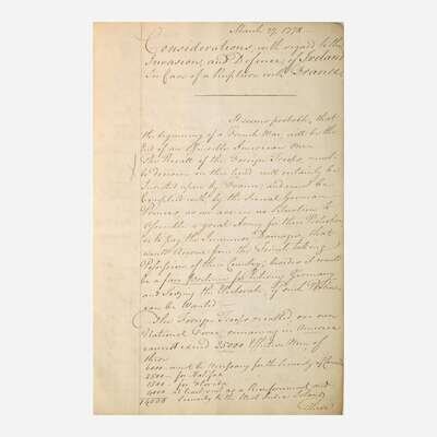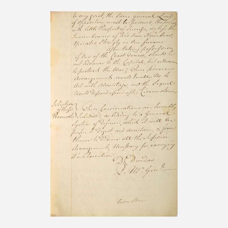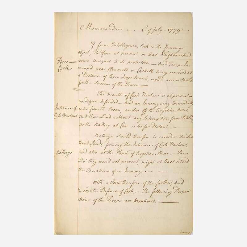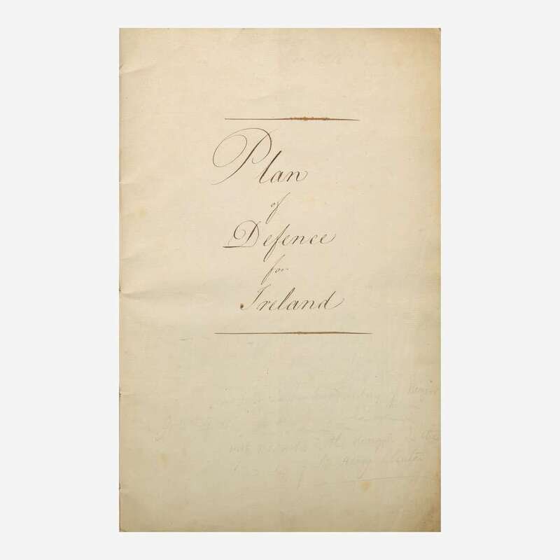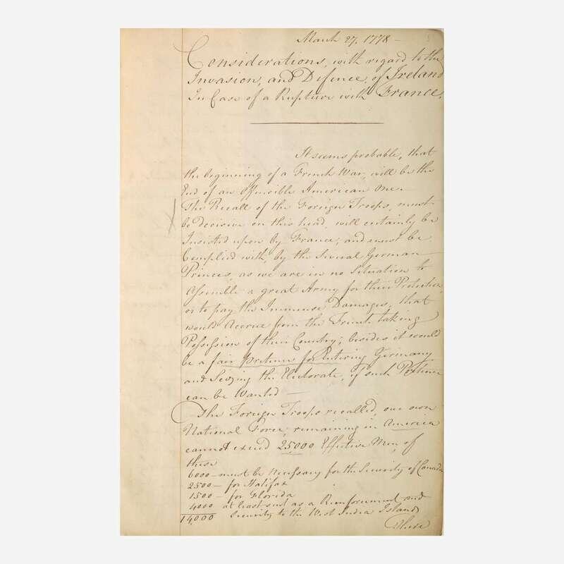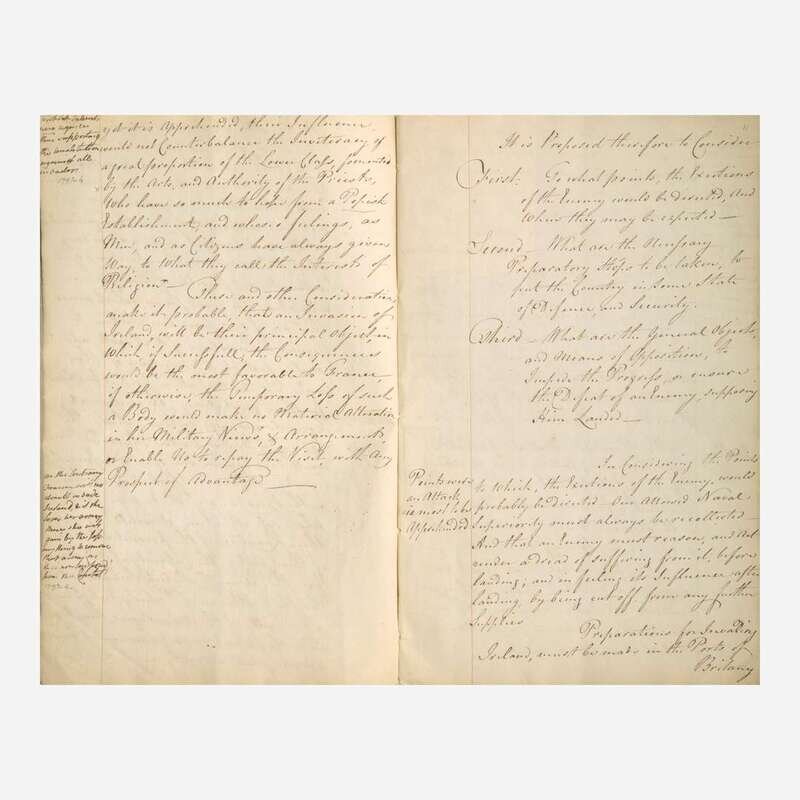 No place, March 27, 1778. Tall 4to. 92 total pages, including a 58-page manuscript document in a secretarial hand of General Sir David Dundas's report on the defense of Ireland, being "Considerations, with regard to the Invasion, and Defence, of Ireland in Case of a Rupture with France"; 26-page "Memorandum", also of Dundas's, dated July 1, 1779, in a different secretarial hand; eight blank pages. Manuscript notations in margins of pp. 7, 10, and 12 attributed to British General Sir Henry Clinton; with numerous additional later marginal pencil notations and underlining in another hand. Contemporary stiff marbled wrappers, detached but present, original thread intact; all edges trimmed.