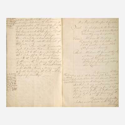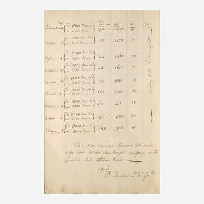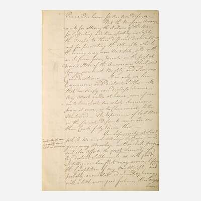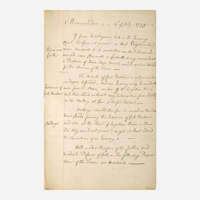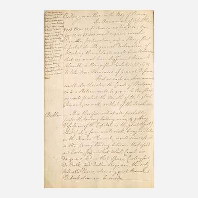 A copy of the manuscript was sold in London at Sotheby, Wilkinson, and Hodge, by Henry Clinton's heirs on March 7-8, 1882 ("Property of the late Colonel Henry Clinton"). In the March 1882 issue of the Magazine of American History (Vol. VIII, No. 3, p. 200), the contents of the sale are described, and they specifically note the sale of "a 'Plan of Defence for Ireland in the event of a French invasion' (MSS. notes in the margin by Sir Henry Clinton)". A previous cataloguer has noted in pencil on the title-page of our copy, "with MSS. notes in the margin in the handwriting of Sir Henry Clinton" (within a larger pencil note, now partially erased). On February 22, 1927, antiquarian bookseller Charles Frederick Heartman sold a copy of this manuscript (item 199) with similar pagination to ours. Laid in to our copy is a typed catalogue description done by historian, collector, and former president of the Manuscript Society, Justin G. Turner, describing this copy as having "various marginal notations" that "resemble the handwriting of General Clinton." Finally, this manuscript was most recently in the collection of bibliophile Dr. Otto O. Fisher (1881-1961). Of the approximately 80,000 items in Fisher's original collection, he either donated, sold, or gave away all but roughly 650. EV Stamps sold those remaining items on December 5, 2021, including this manuscript (162).