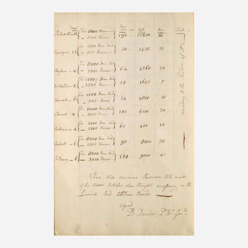 The task of assessing Ireland's vulnerabilities and required defenses fell to British General Sir David Dundas (1735-1820), then Quartermaster General in Ireland, who drafted this report that was then sent to London. Understanding the stakes, Dundas states the consequences of a French invasion in stark terms in the opening statement: "It seems probable, that the beginning of a French War, will be the End of an Offensible American one." A French invasion would be disastrous for Great Britain, with Dundas asserting that, "It is the general and avowed opinion in France that at home we are most vulnerable. The invasion of England or Ireland will certainly be in their contemplation…the internal convulsions and distress which the landing of ten, or twelve thousand men would occasion in our open and defenseless country, the decided effect it would have on the operation of the empire at large, whose sole attention it would engage, their knowledge of the present situation of this country, the certainty of assistance from the Roman Catholic inhabitants. For though the gentlemen of property, enlightened and sensible of the advantages they enjoy under our present mild government, might concur most heartily in its support..." Dundas lays out three points the British government needed to address to counter a French invasion of Ireland: identify possible points of French attack; preparations needed for defense; resources needed to repel an invasion. In the remainder of this document, as well as in a memorandum dated three months later, Dundas, in great detail, answers these questions, including the number of troops needed and where they're to be requisitioned, rations to be gathered, magazines to be established, and hospitals to be created, etc.