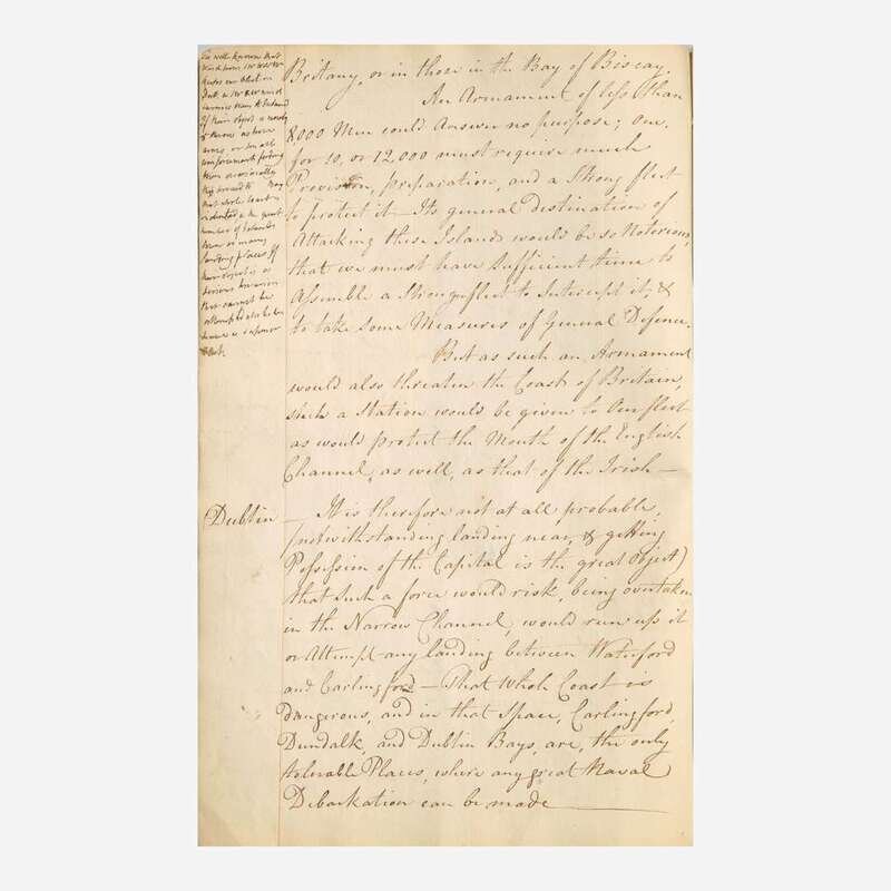 As Dundas elsewhere concludes, it is "probable, that an Invasion of Ireland, will be their principal object, in which if successful, the Consequences would be the most favorable to France," to which one of the notes in the margins states, "on the Contrary France will no doubt invade Ireland, & if she loses her army, there she will gain by the loss..."