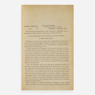 A massive compilation of 235 War Department General Orders issued by the Adjutant General's Office during the Civil War to Union Army commanders in the field. Significantly, the first General Order in this volume is Abraham Lincoln's Emancipation Proclamation, declaring "that all persons held as slaves" within the rebellious areas "are and henceforward shall be free." (Fifth edition, Eberstadt 12). Other important Orders include No. 100, April 24, Francis Leiber's Code, the rules of conduct for Union soldiers, considered the first modern codification of the laws of war; No. 105, April 23, the establishment of the Invalid Corps; No. 143, May 22, the establishment of the United States Colored Troops; No. 194, June 27, the appointment of Major General George Meade as commander of the Army of the Potomac, who would defeat General Robert E. Lee at Gettysburg only days later. Many of the other General Orders concern prisoners of war, court martials, enlistments, soldiers absent without leave, acts of Congress, and other matters relating to the management of the Union Army.