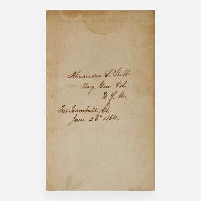 Washington, (D.C.): (Government Printing Office), January-July, 1863. Comprising 236 General Orders, Nos. 1-235, issued by the War Department, Adjutant General's Office, dated January 1-July 27, 1863 (Order No. 126 printed in duplicate); signed in type by Adjutant General L. Thomas and/or Assistant Adjutant General E.D. Townsend, and others. 12mo. Orders separately paginated. Presumably from the library of Brigadier General and Medal of Honor recipient, Alexander S. Webb, and inscribed on front blank, "Alexander S. Webb / Brig. Gen. Vol. / U.S.A. / Fort Trumbull Ct. / June 26th 1864", likely in another hand. Sometime bound in full green cloth-covered boards; all edges stained red; scattered small chipping along some text edges; old repair exposed in gutter, between pp. 8/9 of Order No. 100; split between pp. 6/7 of final Order No. 235, exposing spine.