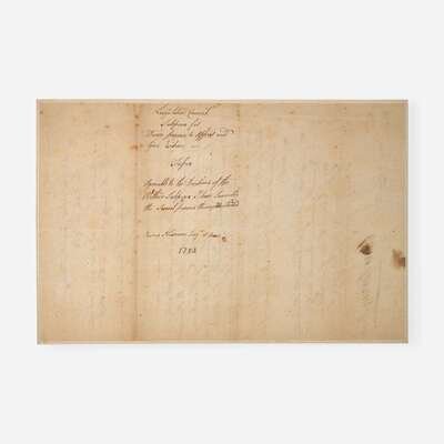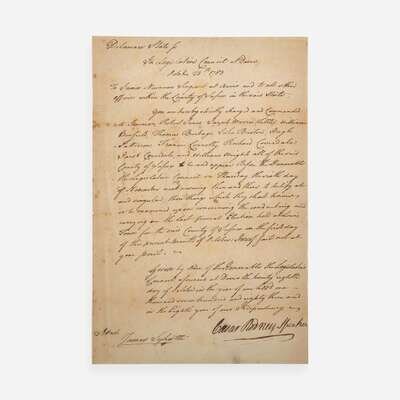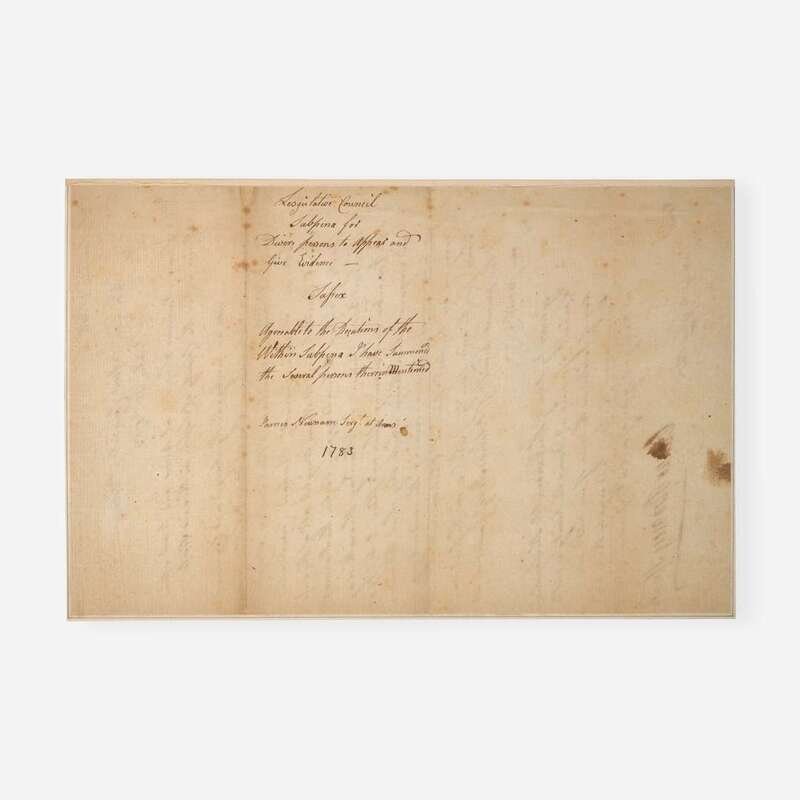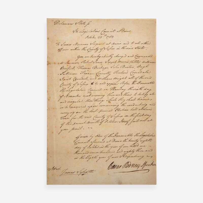 Delaware: In Legislative Council at Dover, October 28, 1783. One page, 12 1/4 x 8 1/8 in. (311 x 206 mm). Manuscript document in a secretarial hand, boldly signed by Founding Father and Signer of the Declaration of Independence from Delaware, Caesar Rodney, as Speaker of the Delaware General Assembly, being a subpoena issued to Robert Jones, Joseph Morris, William Renfield, Thomas Burbage, and six others of Sussex County, for testimony of "things which they shall know or be examined upon concerning the conducting and carrying on the last general Election held at Lewis Town for the said County of Sussex on the first day of this present month..."; counter-signed by James Sykes; docketed on verso, and with additional manuscript by James Newman, Sergeant at Arms. Expertly window mounted; creasing from contemporary folds; small repair at docket fold; scattered foxing on recto and verso; remnant from old mount along right edge of verso.