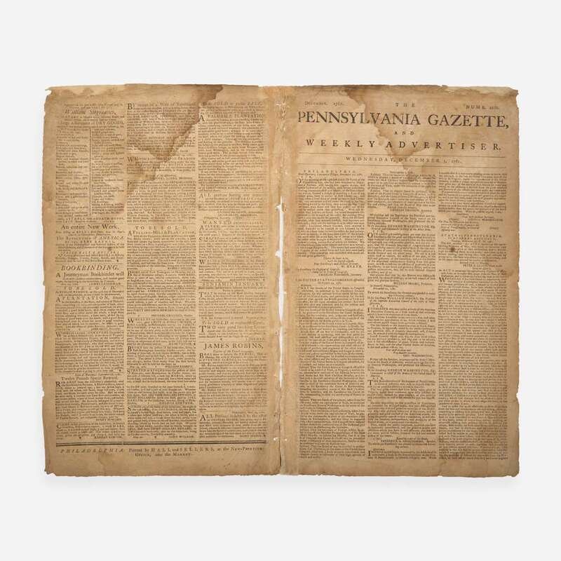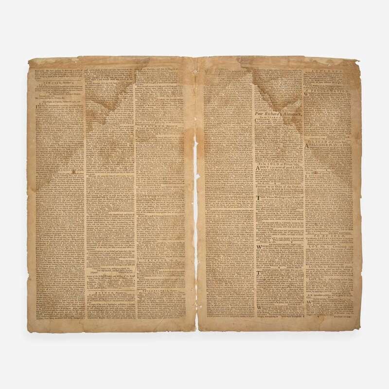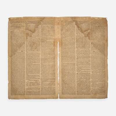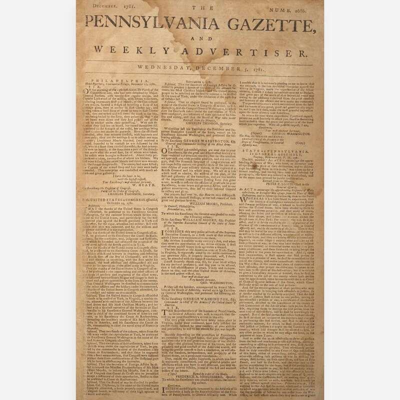 Philadelphia: Printed by Hall and Sellers, Wednesday, December 5, 1781. Numb. 2686. Bifolium sheet, 16 1/4 x 9 7/8 in. (413 x 251 mm). Printed newspaper in three columns. Crease from old fold; wear along edges; dampstain in top corner; largely separated along center fold, with tape remnants from old reinforcement to same, affecting bordering text; scattered soiling; repairs along top edge; contemporary ownership signature at top of front page.