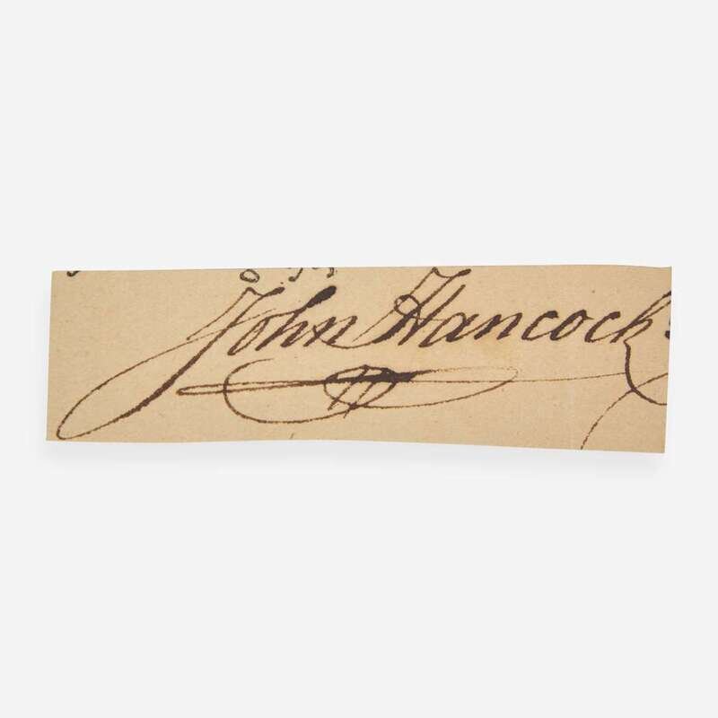 No place, no date. Signature of John Hancock cut from another document, and touching some letters in his name. 1 x 3 in. (25 x 76 mm).