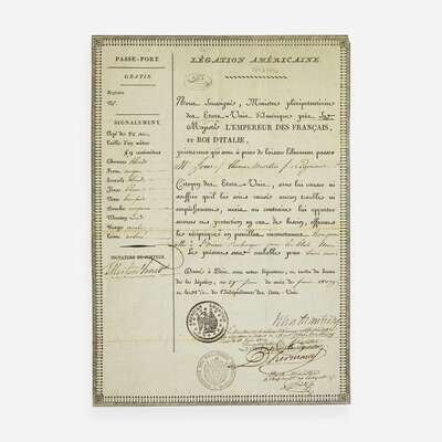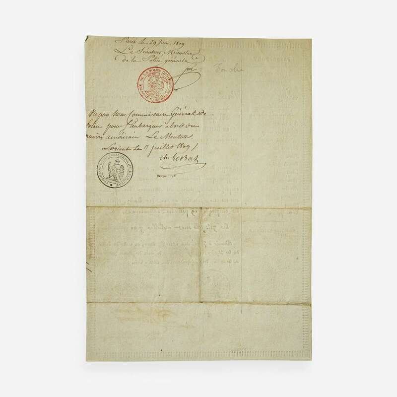 Paris, June 1809. One sheet, 12 3/8 x 8 5/8 in. (314 x 219 mm). Partially-printed French passport, signed by Armstrong as Minister Plenipotentiary of the United-States to France, as well as two French Ministers, and issued to American traders M. Jones and Thomas Morton; "American Legation" and "Ministre des Relations Exterieures" ink stamps at bottom; signed on verso by French Minister of Police Joseph Fouche, and the French Commissar General of Police; creasing from contemporary folds.