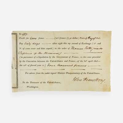 Paris, August 4, 1805. One oblong sheet, 5 1/4 x 8 1/2 in. (140 x 216 mm). Partially-printed second bill of exchange (No. 487) for 4,000 francs to be paid from the United States Treasury to shipping merchant Thomas Cutts, Jr.: "Pay Sixty days--after sight this my second of Exchange...to the order of Thomas Cutts junior (Captain of the Minerva)--(in pursuance of a liquidation by the Government of France, in this case provided by the Convention between the United-States and France, of the 30th april 1803...)"; signed by John Armstrong as Minister Plenipotentiary of the United-States to France; remnants of contemporary French ink stamp at left edge. Creasing from old folds; scattered edge-wear; glue residue from old mount on verso. Hessler, An Illustrated History of U.S. Loans (1988), "1-3 surviving pieces" (p. 80)