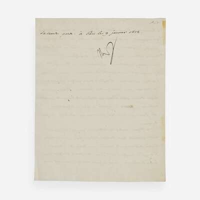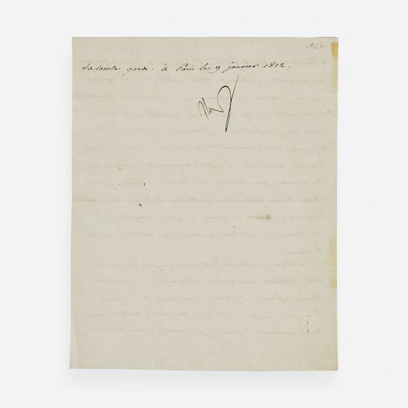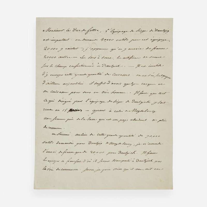 No place (likely Eastern Europe), January 9, 1812. One sheet, 9 1/8 x 7 1/4 in. (232 x 184 mm). Manuscript letter in French in a secretarial hand, signed by Napoleon Bonaparte ("Nap"), to his Minister of War, Henri Jacques Guillaume Clarke, Duc de Feltre, instructing him on supplies and troops needed for the garrison city of Danzig and other preparations for the Grande Armée's military. Small remnants from previous mount, right side recto, not affecting signature.