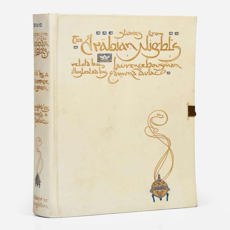 London: Hodder and Stoughton, (1907). First and deluxe limited edition, #243/350 numbered copies, signed by Dulac. 4to. xvi, (134) pp. Illustrated with mounted color frontispiece and 49 mounted color plates bound in at rear, all with captioned tissue guards. Publisher's full vellum, slightly bowed, stamped in gilt, blue and yellow; top edge gilt; other edges untrimmed; green cloth ties likely replaced; previous owner's book-plate on front free endpaper; Hughey 16