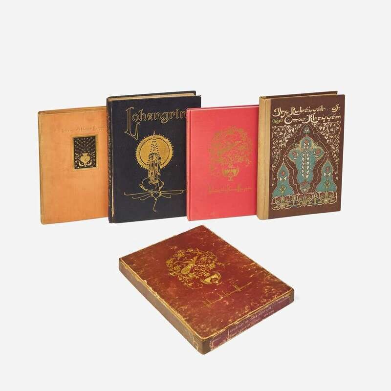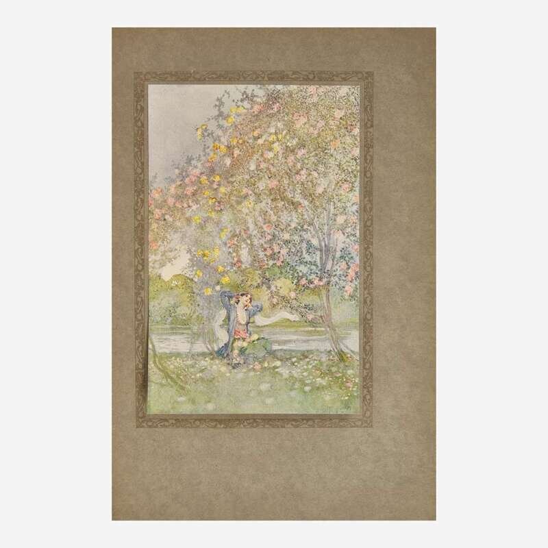London: George G. Harrap & Co., (1909). First English edition. 4to. Unpaginated. Illustrated with 24 mounted color illustrations, and numerous in-text illustrations. Text, adornments, and additional illustrations printed in celadon, brown, rose, lilac, and turquoise. Publisher's quarter tan cloth over illustrated brown paper-covered boards; top edge gilt, other edges untrimmed; illustrated endpapers; separations in gutter of first gathering.