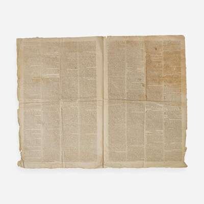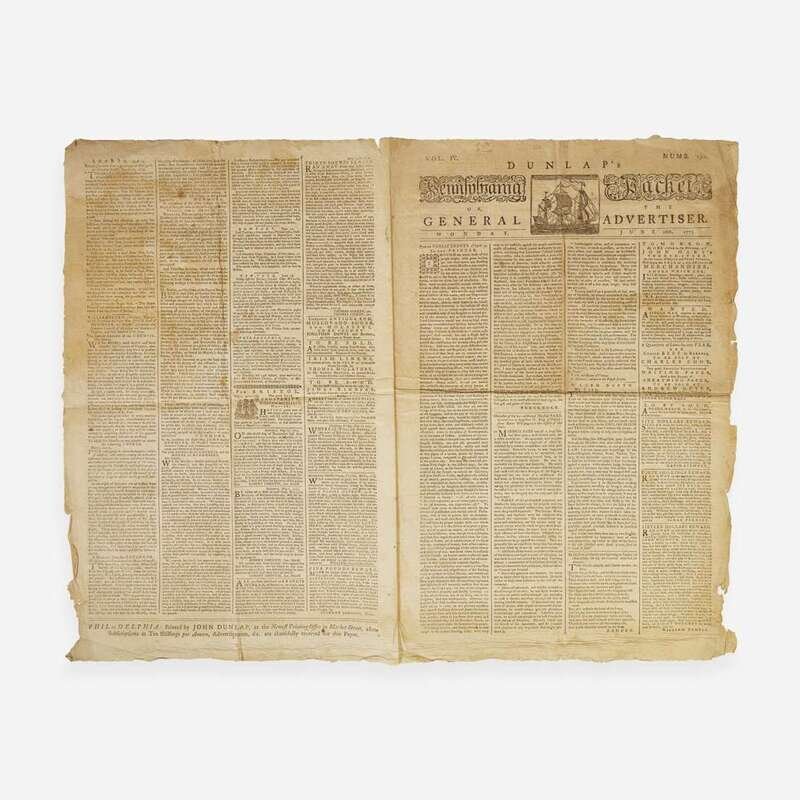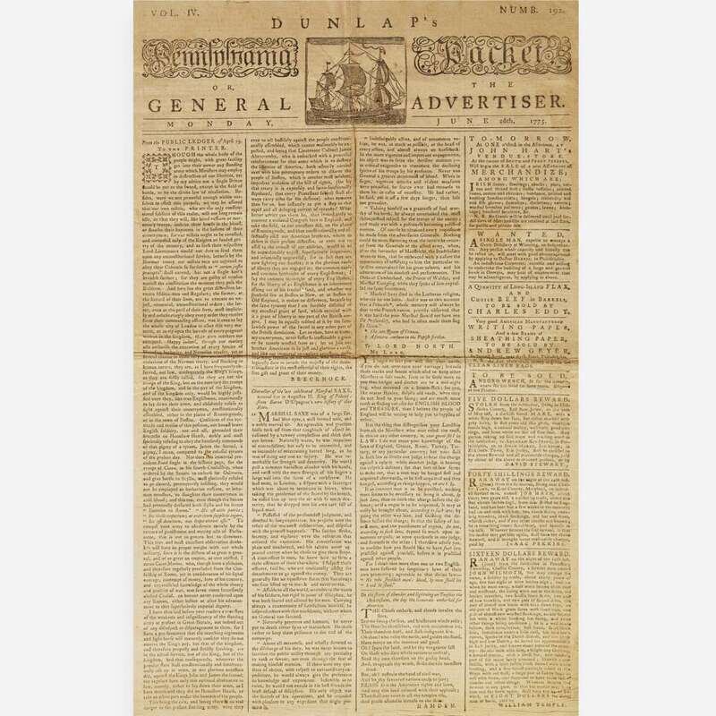 Philadelphia: Printed by John Dunlap, Monday, June 26, 1775. Vol. IV, Numb. 192. Bifolium sheet, 19 1/2 x 12 3/4 in. (495 x 324 mm). Printed newspaper in four columns. Creasing from contemporary folds; edges untrimmed; scattered spotting; light creasing along edges.