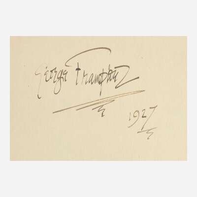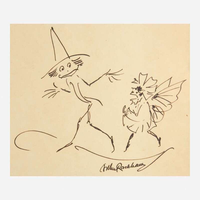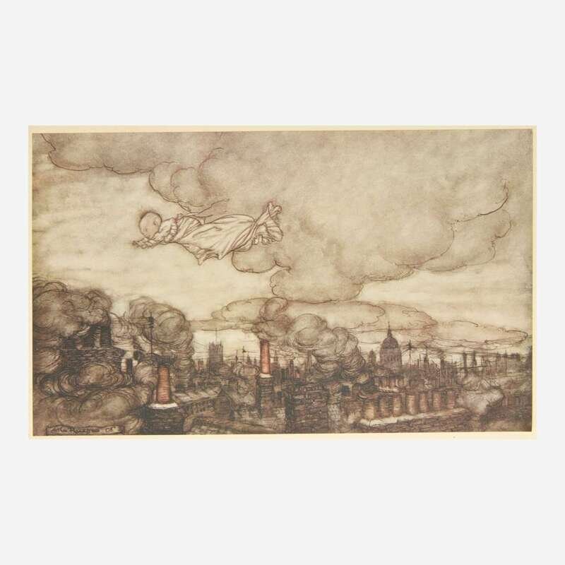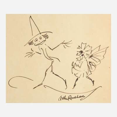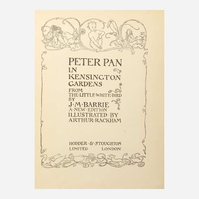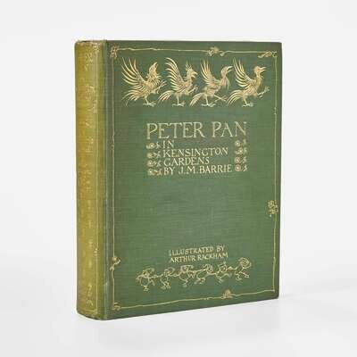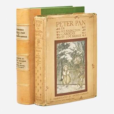 London: Hodder & Stoughton Limited, (1912). "New Edition" (reprint of the 1906 edition, in a larger format, and with new illustrations and color plates distributed throughout the text). 4to. (viii), (126) pp., (1) pp. Illustrated with color frontispiece and 49 color plates, all mounted and all with captioned tissue guards, plus many black and white in-text illustrations. Publisher's green cloth, elaborately stamped in gilt; all edges trimmed; dust-jacket; in quarter tan goatskin solander box; separations at gutter in pp. 32-33, 40-41, 64-65, 80-81, 88-89, 120-121; one-inch tear in bottom edge of title-page; black and white plate between pp. 62-63 starting. Signed by sculptor of Peter Pan statue in Kensington Gardens, George Frampton (1860-1928) on front paste-down; author J.M. Barrie (1860-1937) on verso of front free endpaper; inscribed and signed by Princess Beatrice "of Great Britain & Ireland" (1857-1944) and Princess Marie Louise (1872-1956) on same; Arthur Rackham has signed his name under a large original illustration of his verso on recto of frontispiece; signed by Nadejda "Nada" Mountbatten, Marchioness of Milford Haven (1896-1963) on same. Most signatures dated 1927. Latimore & Haskell, p. 40; Riall, p. 114