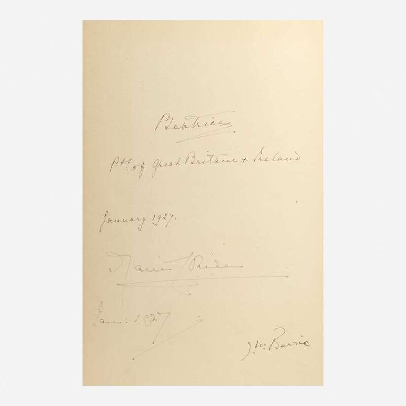 A fantastic association copy and with an original Rackham illustration. A January 4, 1927 issue of the Westminster Gazette explains the book's origins as a prize offered for "the best costumes from 'Peter Pan' and 'Peter Pan in Kensington Gardens'" at an annual London charity "Peter Pan" party. "There were not many 'Peter Pans.' Boys preferred pirates, most of them fierce-looking, with daggers protruding from their belts. Among the prizes were books of the play by Sir J. M. Barrie, autographed by Princess Beatrice, Princess Marie Louise, Lady Milford Haven, Sir James Barrie, Sir George Frampton, and Mr. Arthur Rackham."