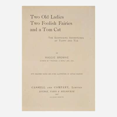London: Duckworth and Co., (1910). First edition in book form. (xii), 130, (2) pp. Illustrated with color frontispiece, 5 color illustrations, and numerous in-text black and white illustrations. Publisher's brown cloth, stamped in blind and in black; top edge gilt, other edges trimmed; prelims foxed, with some offsetting. From the library of Rackham bibliographer Sarah Briggs Latimore and with her original receipt laid in. Latimore & Haskell p. 36, Riall p. 98