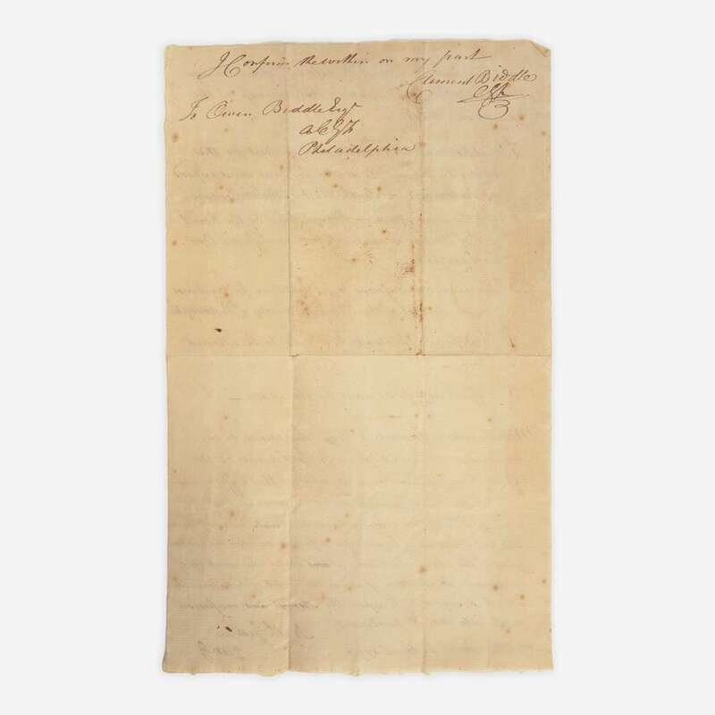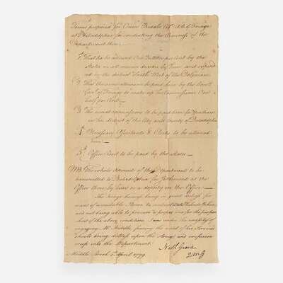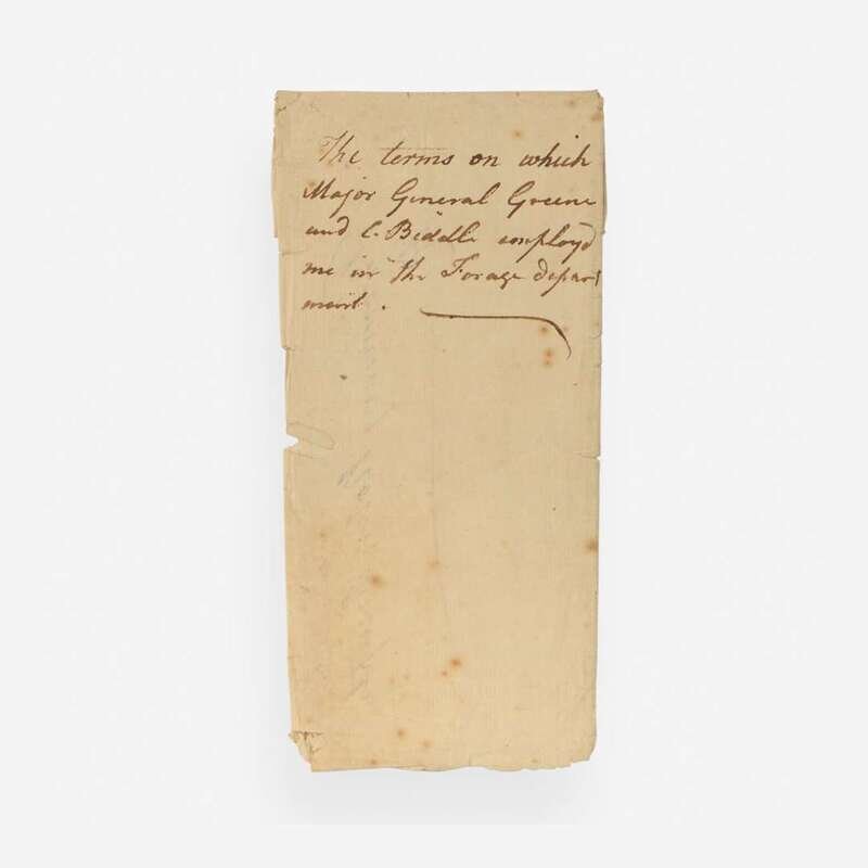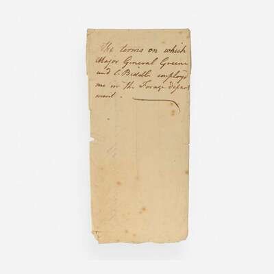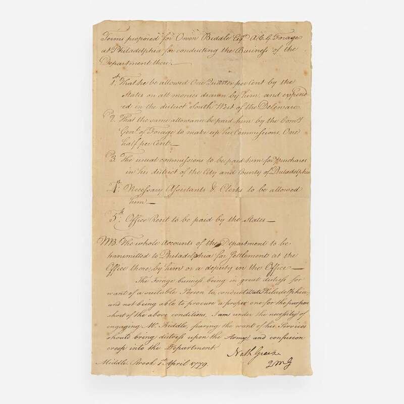Middle-Brook, (New Jersey), April 1, 1779. One sheet, 12 1/4 x 7 1/2 in. (311 x 190 mm). Manuscript document in a secretarial hand, signed by Quartermaster General Nathanael Greene ("Nath Greene / QMG"), confirming the terms of employment for Owen Biddle, Sr., as Assistant Commissary General of Forage in the Quartermaster Department in Philadelphia; inscribed on verso by Owen's brother, Clement Biddle, as Commissary General of Forage, "I Confirm the within on my part / Clement Biddle / To Owen Biddle Esq / ACGF / Philadelphia". Creasing from contemporary folds; scattered minor spotting; with separate leaf used to enclose the above document, inscribed by Owen Biddle, "The terms on which / Major General Greene / and C. Biddle employed / me in the Forage Depart / ment." This document is transcribed and reproduced in Owen Biddle in The Pennsylvania Magazine of History and Biography, Vol. 16, No. 3 (Oct., 1892), pp. 311-313.