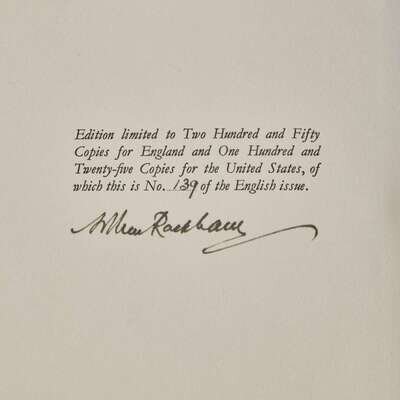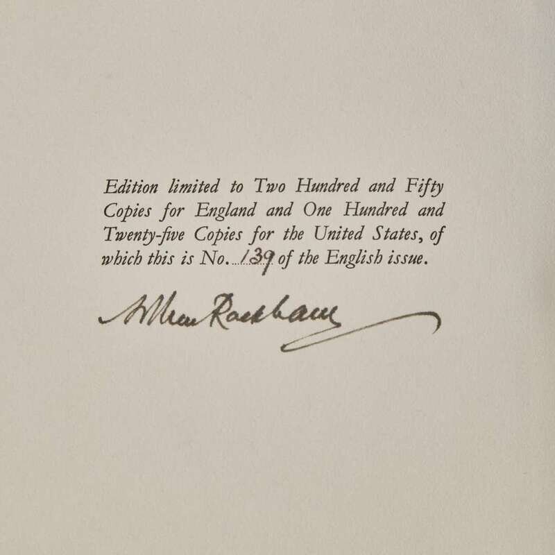 London: George G. Harrap & Co. Ltd., (1928). First and limited edition, #139/250 numbered copies, signed by Rackham (from a total edition of 375). 4to. (vi), (104) pp. Illustrated with color frontispiece and 7 color plates, all mounted, and numerous in-text black and white illustrations. Publisher's deluxe full vellum, stamped in gilt, slightly bowed, stain in upper edge of rear board; top edge gilt, other edges untrimmed; illustrated endpapers; Latimore & Haskell, pp. 63-64; Riall p. 164