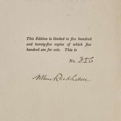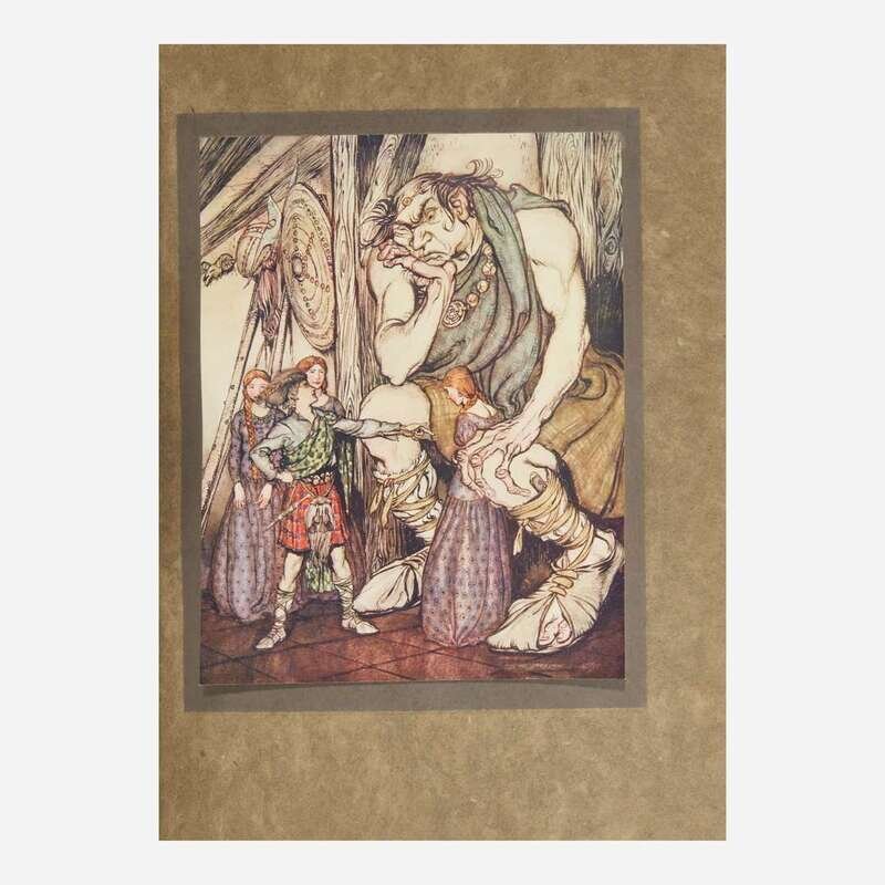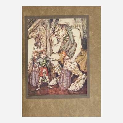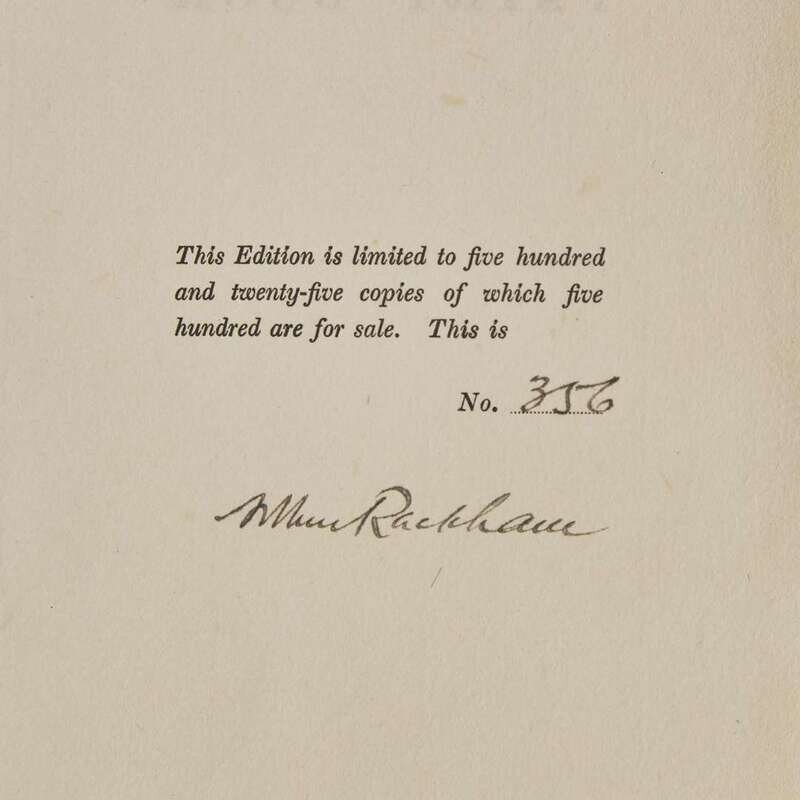 London: William Heinemann/New York: J.B. Lippincott Co. (1916). First and limited edition, #356/500 numbered copies, signed by Rackham (from a total edition of 525). 4to. xxii, (122), (2) pp. Illustrated with color frontispiece and 11 color plates, all mounted and all with captioned tissue guards, and numerous in-text black and white illustrations. Publisher's blue cloth, stamped in gilt; top edge gilt, other edges untrimmed; illustrated endpapers, foxed and with offsetting; offsetting to some tissue guards and pages opposite heavy brown paper; scattered light foxing to text; Contemporary gift inscription on front free endpaper; blue silk bookmark intact; Latimore & Haskell, pp. 45-46; Riall p. 128