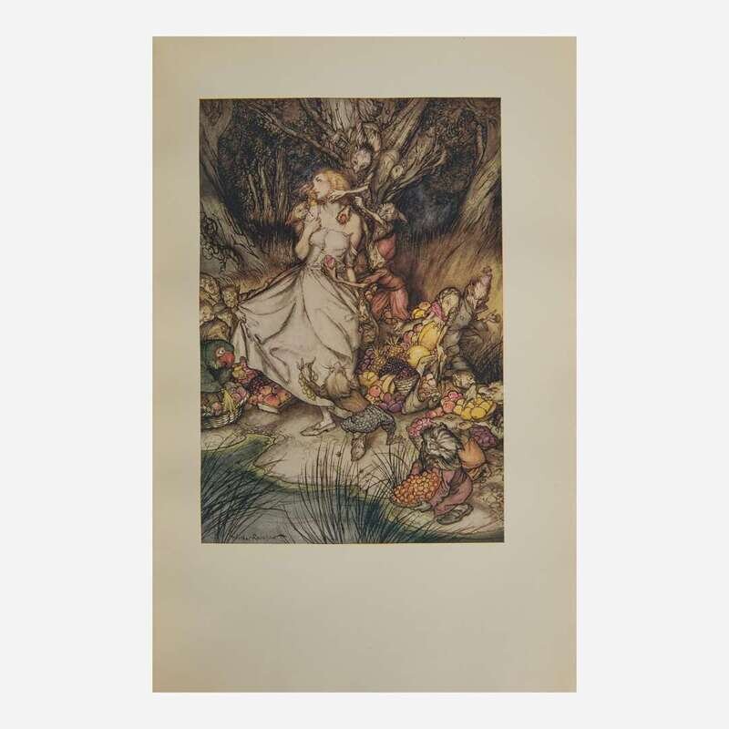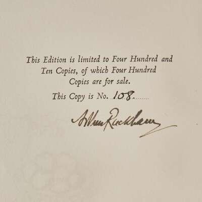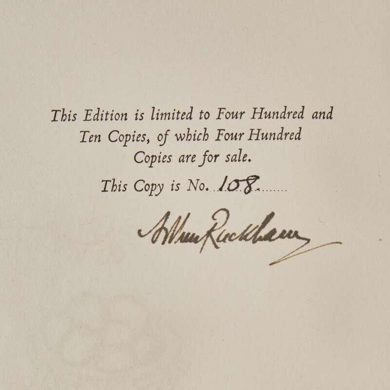 London: George G. Harrap & Co. Ltd., (1933). First and limited edition, #108/400 numbered copies, signed by Rackham (from a total edition of 410). 8vo. (viii), (46), (1) pp. Illustrated with color frontispiece and 3 color plates and numerous in-text black and white illustrations. Publisher's limp vellum, lettered in gilt; top edge gilt, other edges untrimmed; illustrated endpapers; in publisher's paper-covered slip case with title label and matching number. Latimore and Haskell, p. 69; Riall, p. 179
