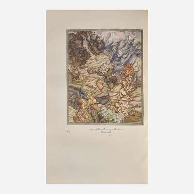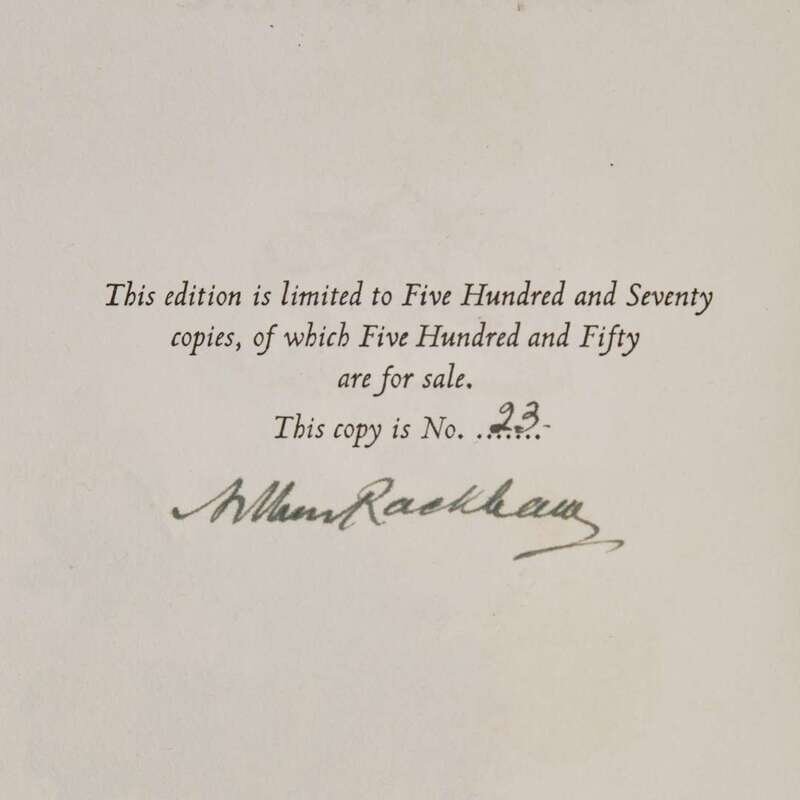 London: George Harrap & Co. Ltd., (1932). First and limited edition, #23/550 numbered copies, signed by Rackham (from a total edition of 570). 8vo. (viii), (48) pp. Illustrated with color frontispiece, 3 color plates, and numerous in-text black and white illustrations. Publisher's limp vellum, lettered in gilt; top edge gilt, other edges untrimmed; illustrated endpapers; previous owner's book-plate on verso of front free endpaper; in publisher's paper-covered slip case with title label and matching limitation number. Latimore & Haskell, p. 67; Riall p. 176