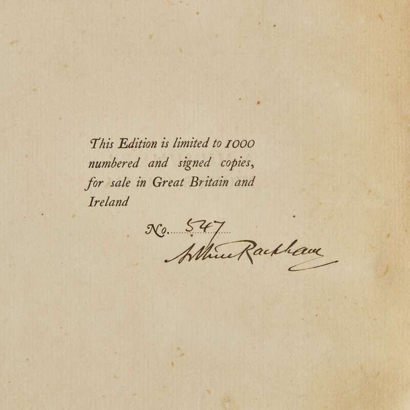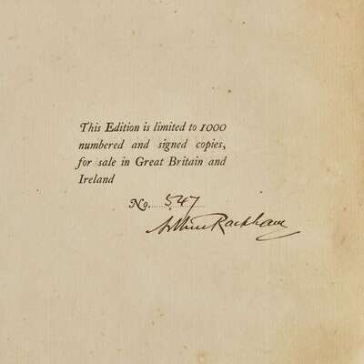 London: William Heinemann/New York: Doubleday, Page & Co., 1908. First and limited edition, #547/1,000 numbered copies, signed by Rackham. 4to. (viii), 134 pp., (1) p. Illustrated with color frontispiece and 40 color plates, all mounted and all with captioned tissue guards, and numerous in-text black and white illustrations. Publisher's deluxe full vellum, decorated in gilt; top edge gilt, other edges untrimmed; silk ties renewed; some scattered light foxing; prelims toned; offsetting to tissue guards and pages opposite heavy brown paper; in quarter vellum over Japanese vellum fall-down-back box. Latimore & Haskell, p. 32; Riall, p. 87