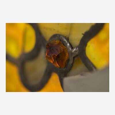 With leaded ripple, streaky, mottled, textured, opalescent, dichroic, acid-etched glass, and rough-cut "jewels", with select glass panes plated to reverse.