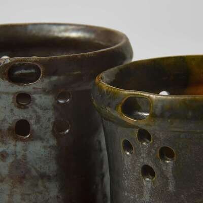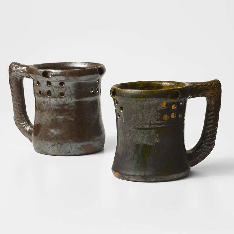 George Ohr (American, 1857-1918) Two Puzzle Mugs in Mirror Brown and Olive Glaze, Biloxi, Mississippi, USA, circa 1898-1910