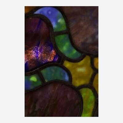 With leaded ripple, feather, streaky, mottled, textured, opalescent, dichroic, acid-etched, and painted glass, with select glass panes plated to reverse.