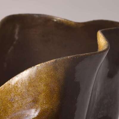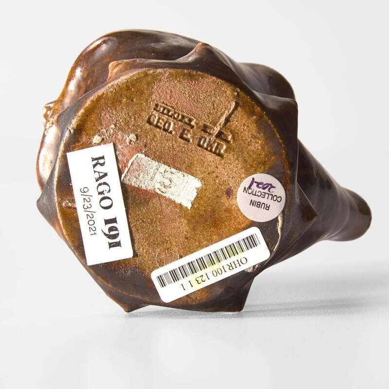 George Ohr (American, 1857-1918) Crumpled Pitcher with Attached Underplate in Mottled Brown Glaze, Biloxi, Mississippi, USA, circa 1895-1896